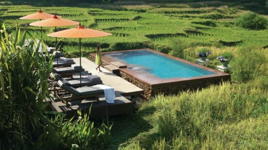 Back up north in the verdant countryside that surrounds Chiang Mai, the Thai-style pavilions and villas of Four Seasons Chiang Mai are surrounded by landscaped gardens and paddy fields with a backdrop of the highland’s mountains.