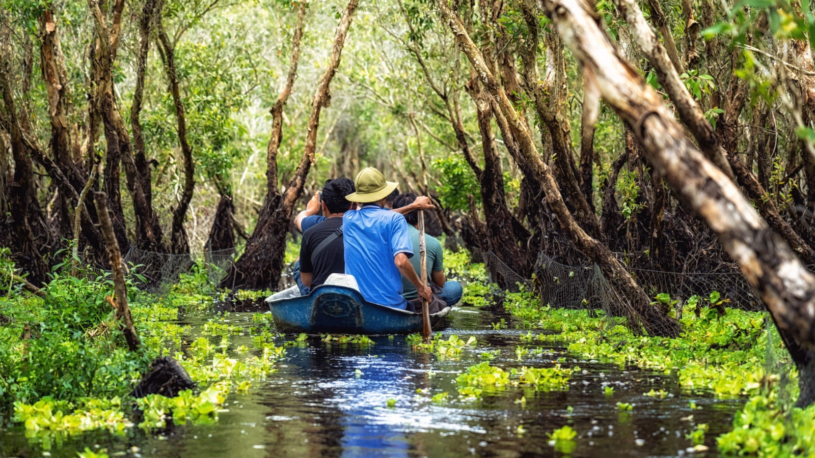 Journey by sampan into the Tra Su Cajuput Forest. The 845 hectare preserve is a colony for 70 bird species including the rare painted stork and Oriental darter, as well as bats, snakes and endangered turtles.