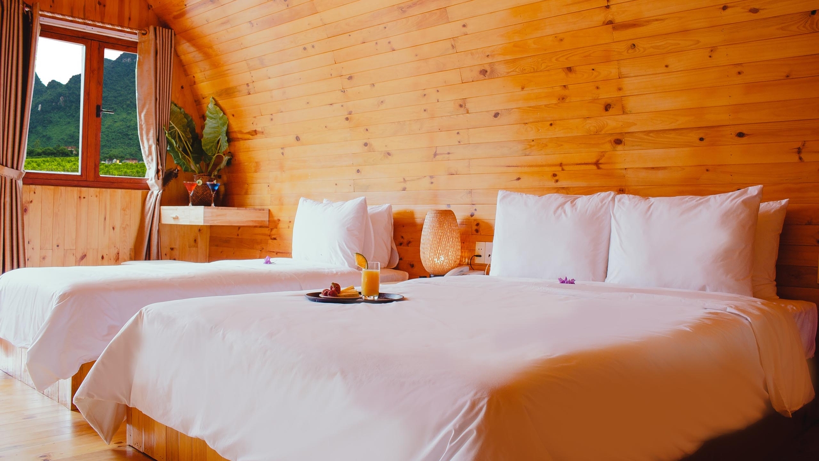 The 39 rooms, housed within snug bungalows and cottages, with some encompassing pinewood barrelled ceilings, rest at the base of towering limestone karsts surrounded by landscaped gardens and farm fields. Natural design elements along with light and airy interiors and large windows allow guests to feel immersed in the exterior environment.