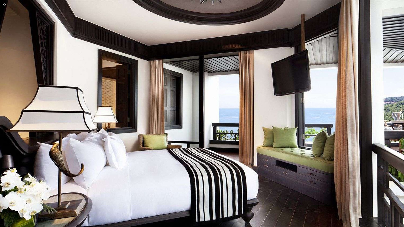 A fully realised creation of designer Bill Bensley, 197 rooms and suites are scattered around the sheltered bay and its private beach.
