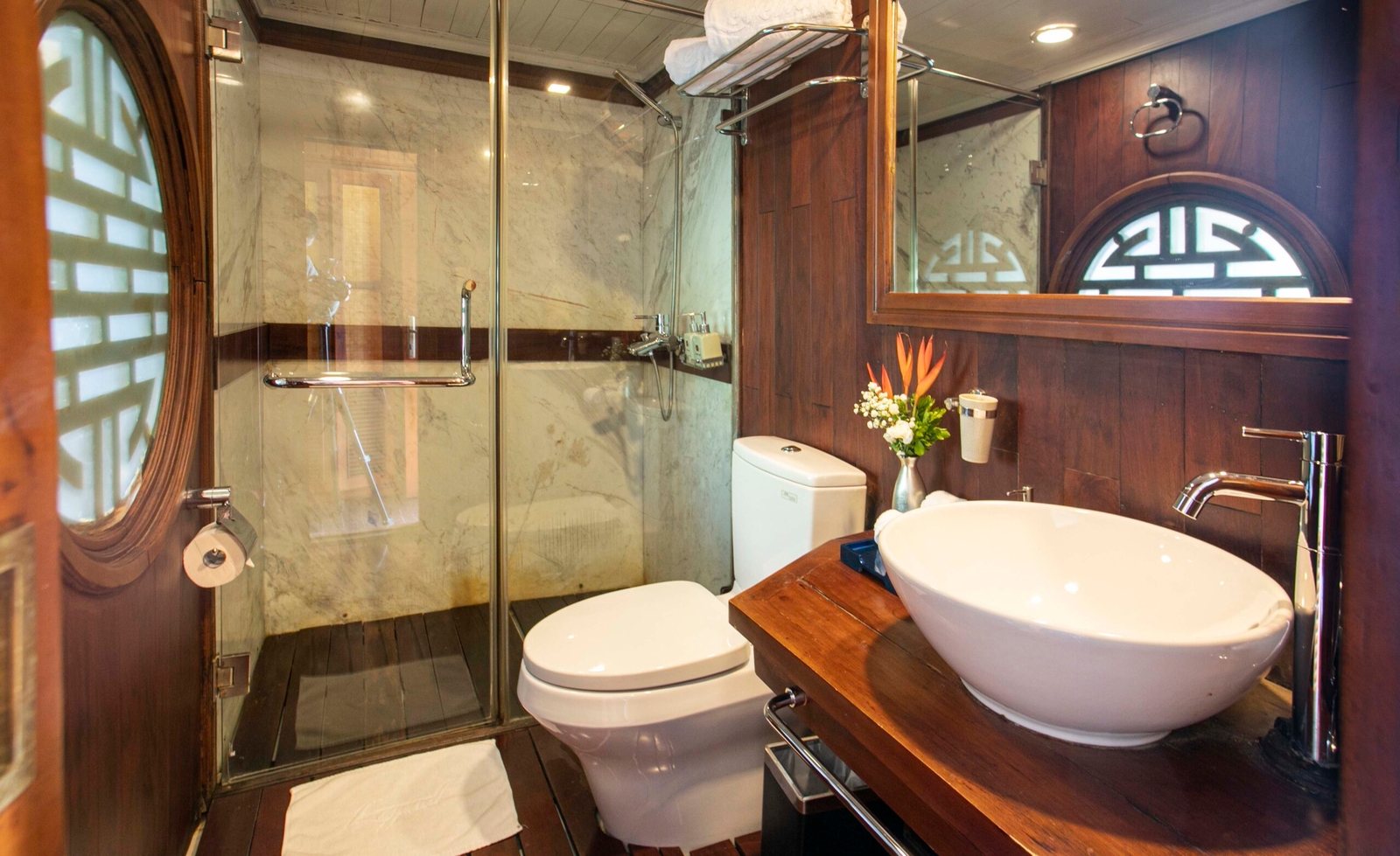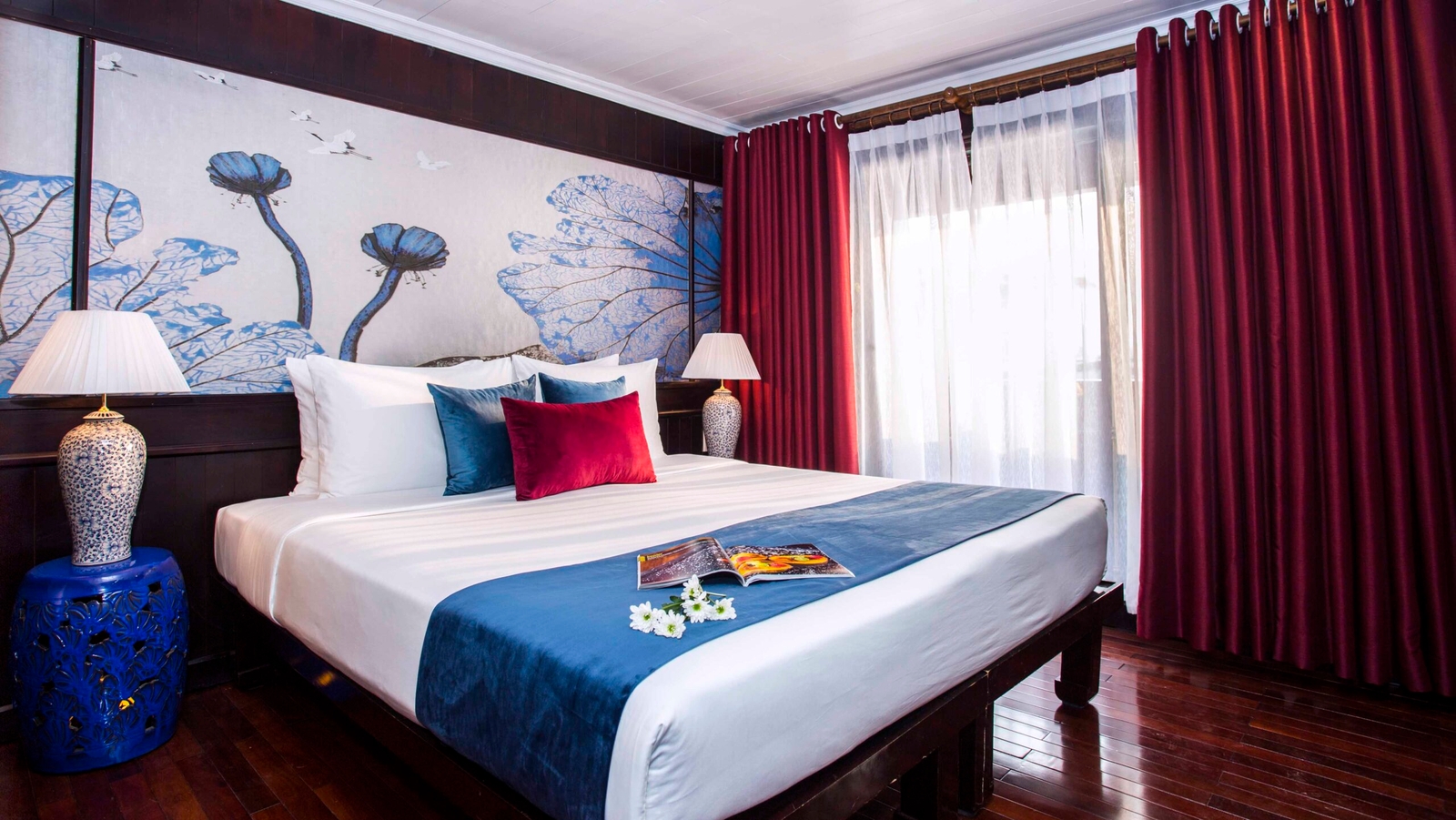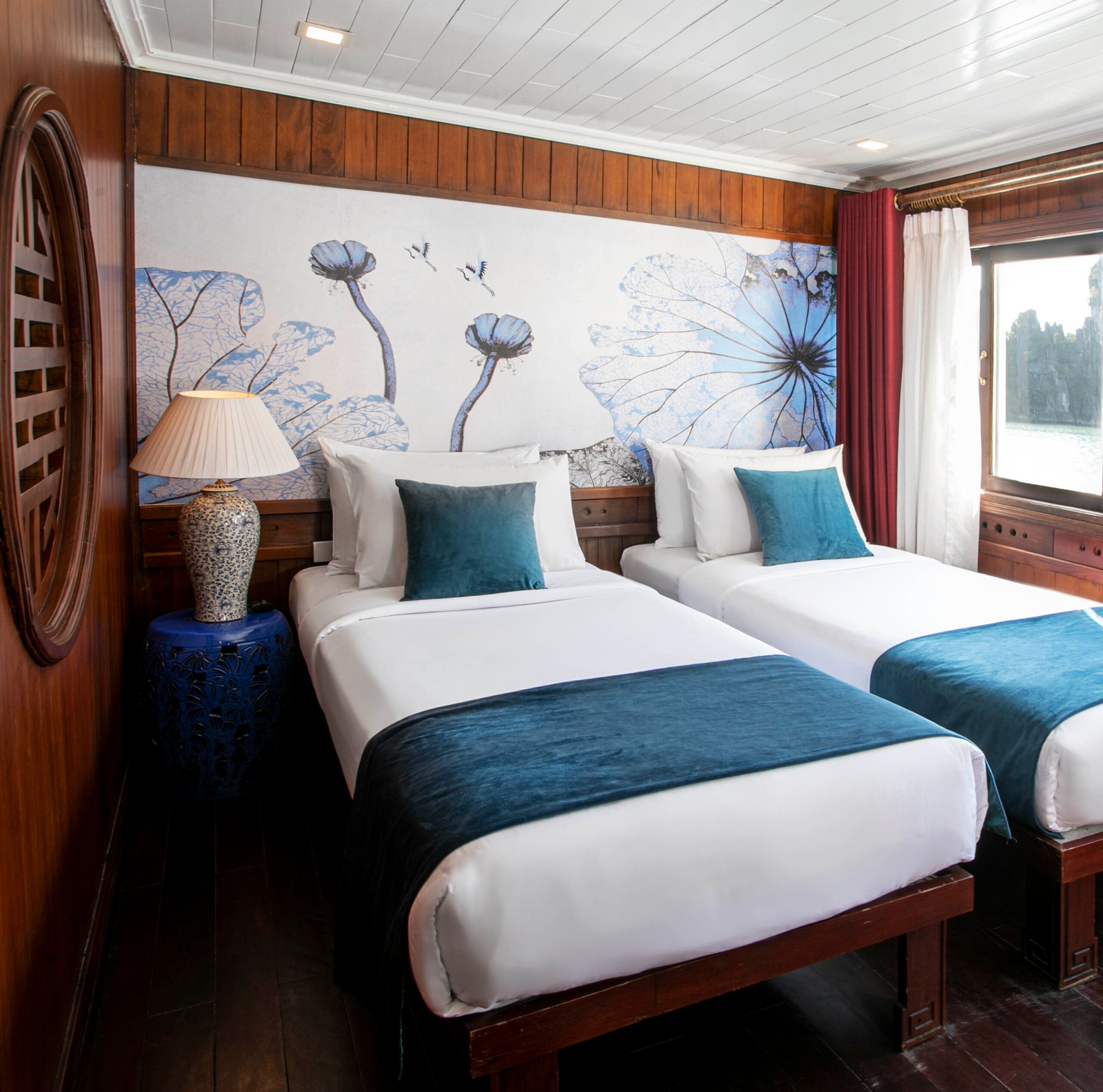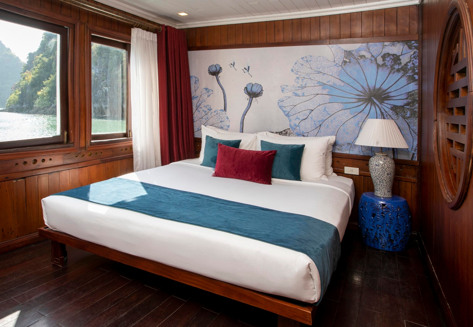 Sleeping four passengers in total, the ship’s crew of captain, chef, deckhand and hostess will be on hand at all times to fulfil your needs. The teak-lined cabins themselves may be modestly sized, but are furnished in an inviting contemporary-Vietnamese style, complete with double or twin beds, crisp linen, hot-water showers and air conditioning.