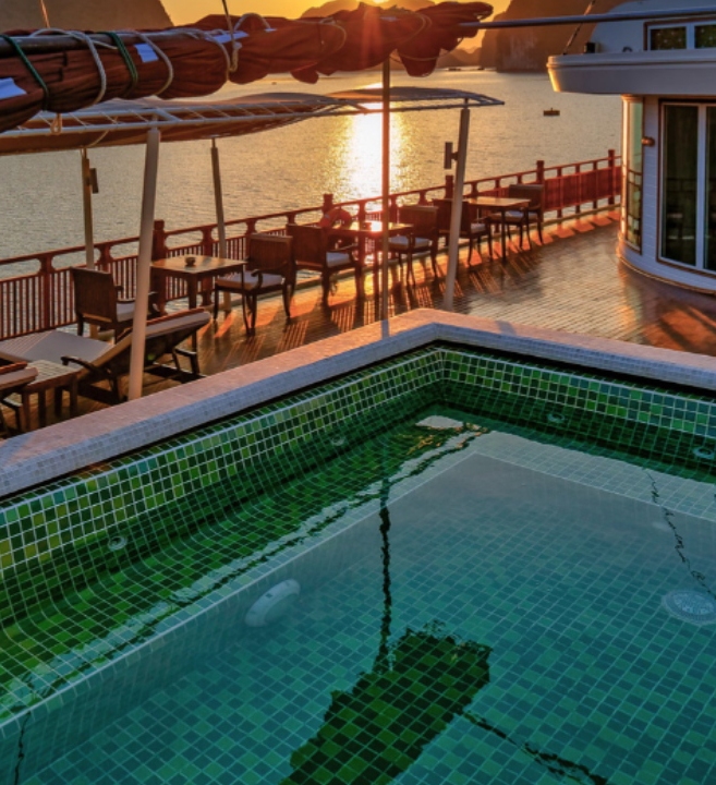 Guests can indulge in pampering and treatments at the vast spa, which encompasses a sauna and partake in mediation sessions on the upper deck. The beautiful library salon is ideal for relaxing with a book, and the restaurant and bar serve Vietnamese cuisine in a charming space of wood-paneled walls and rattan furniture. An outdoor pool and terrace can also be found on the deck.