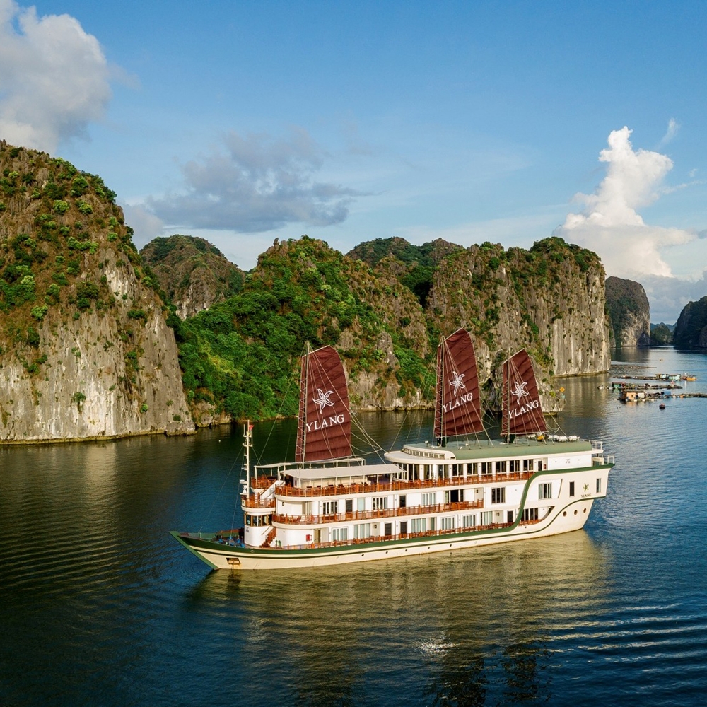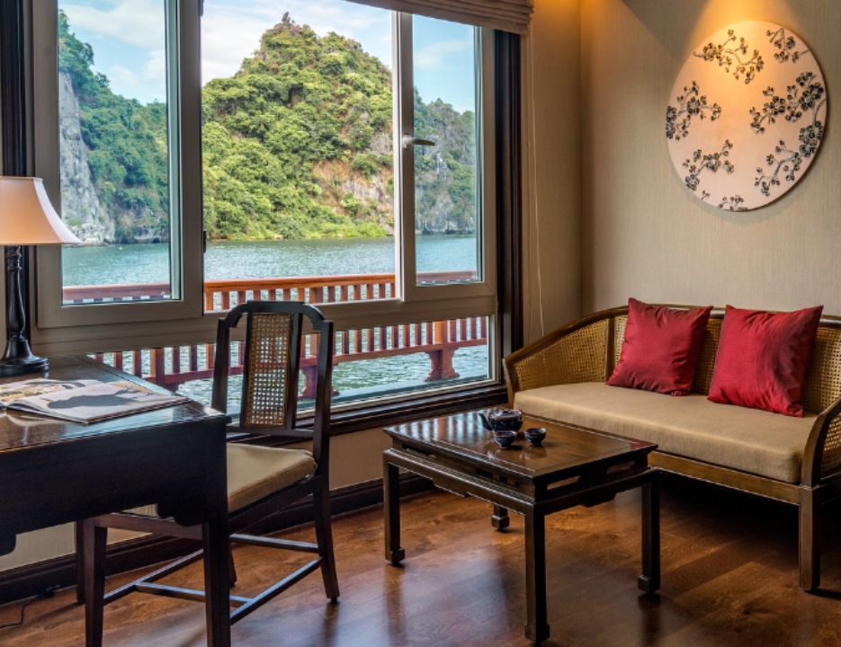 This luxury vessel is a mix of Asian-Vietnamese design, further influenced by French-colonial touches. Ten suites are situated across two decks, with décor inspired by the different blossom seasons. Floor-to-ceiling doors lead to private balconies, allowing light to fill the interiors.