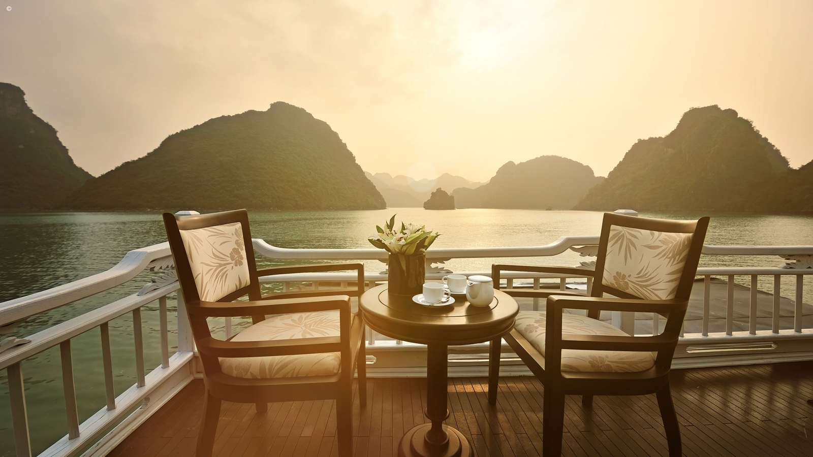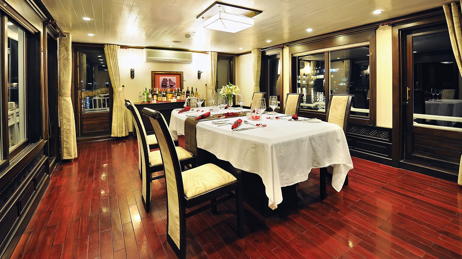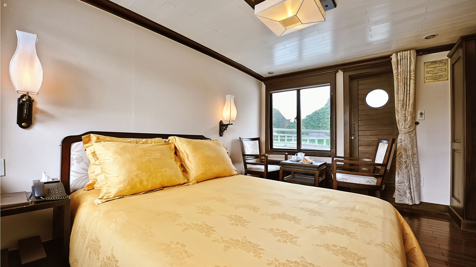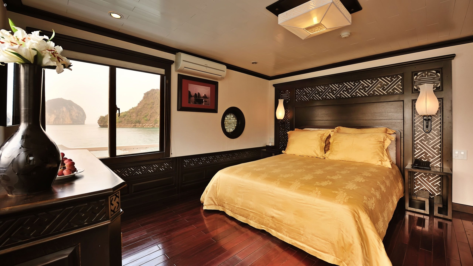 The two Deluxe cabins are elegantly appointed in a simple, modern Vietnamese style and feature en-suite marble bathrooms and flat-screen TVs. The much larger Master Suite comes with an expanse of wooden floor space as a private balcony.