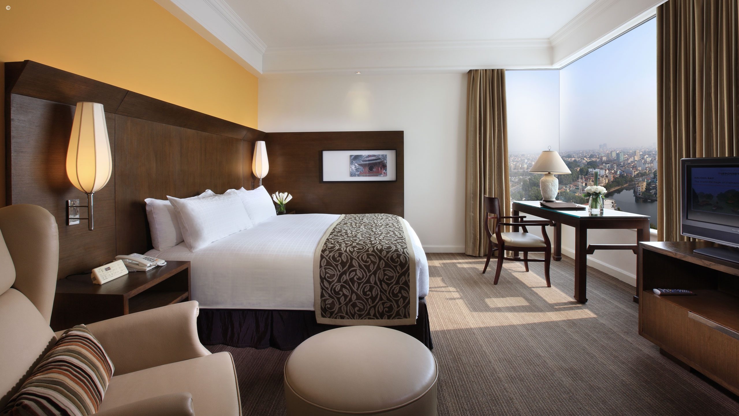 The newly renovated rooms are tastefully decorated, infused with inspired Vietnamese touches. A chic contrast of dark wood and delicate cream fabrics give the 273 rooms an exquisite and contemporary feel. An atmosphere of opulence is continued throughout with marble bathrooms and complimentary French bath products. The rooms boast wall to wall windows with the most spectacular views over the lakes of Hanoi.