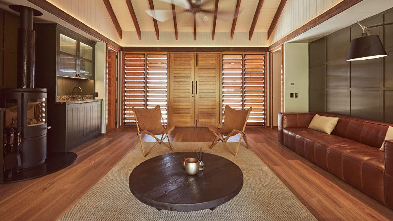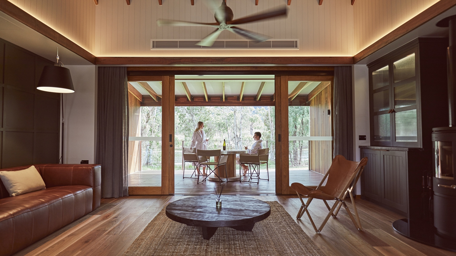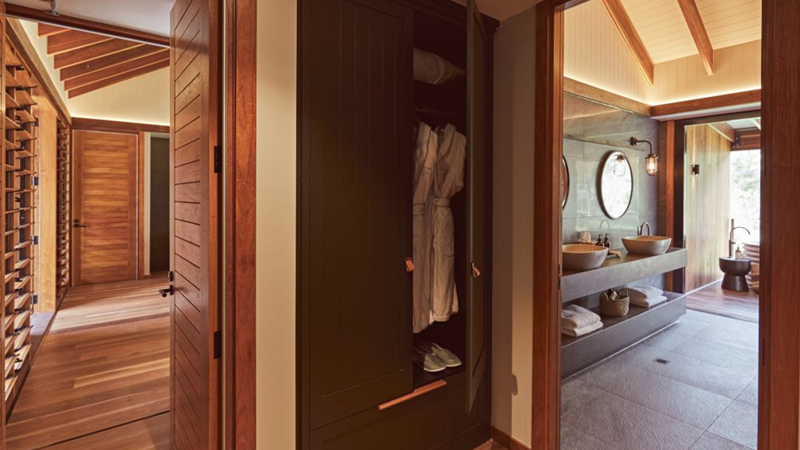 The lodge sits in the shadows of the imposing Mount Mulligan, bounded by a dramatic landscape and enclosed with eucalyptus woodlands. Eight guest rooms, including three suites, can house up to 16 guests, and come with assigned private electric buggies for easy access around the property. Interiors are filled with natural furnishings, such as spotted gum timber cladding, while earthy colour schemes create soothing spaces. Timber-framed glass doors open up onto private decks, deep outdoor baths and utterly spectacular vistas.