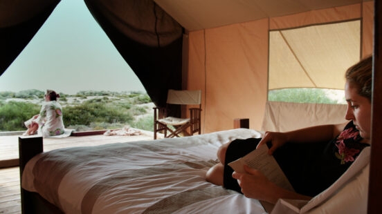 Situated close to the clear waters and bright sand of Jervis Bay’s beaches, Paperbark Camp offers guests the best in canvas accommodation surrounded by a nature lover’s paradise. The twelve canvas tents have been thoughtfully placed above ground amongst soaring eucalyptus trees and intriguing paperbarks. Each one offers not only privacy, but also wrap-around decking, full insect screening, solar lighting and luxurious linen. Paperbark Camp’s showstopper is The Gunyah, a restaurant in the tree tops where guests can enjoy their meals.