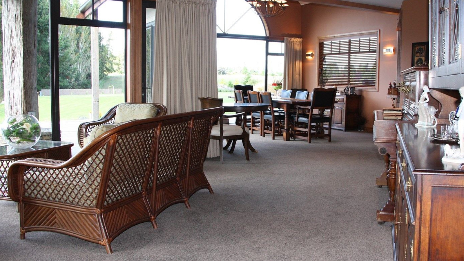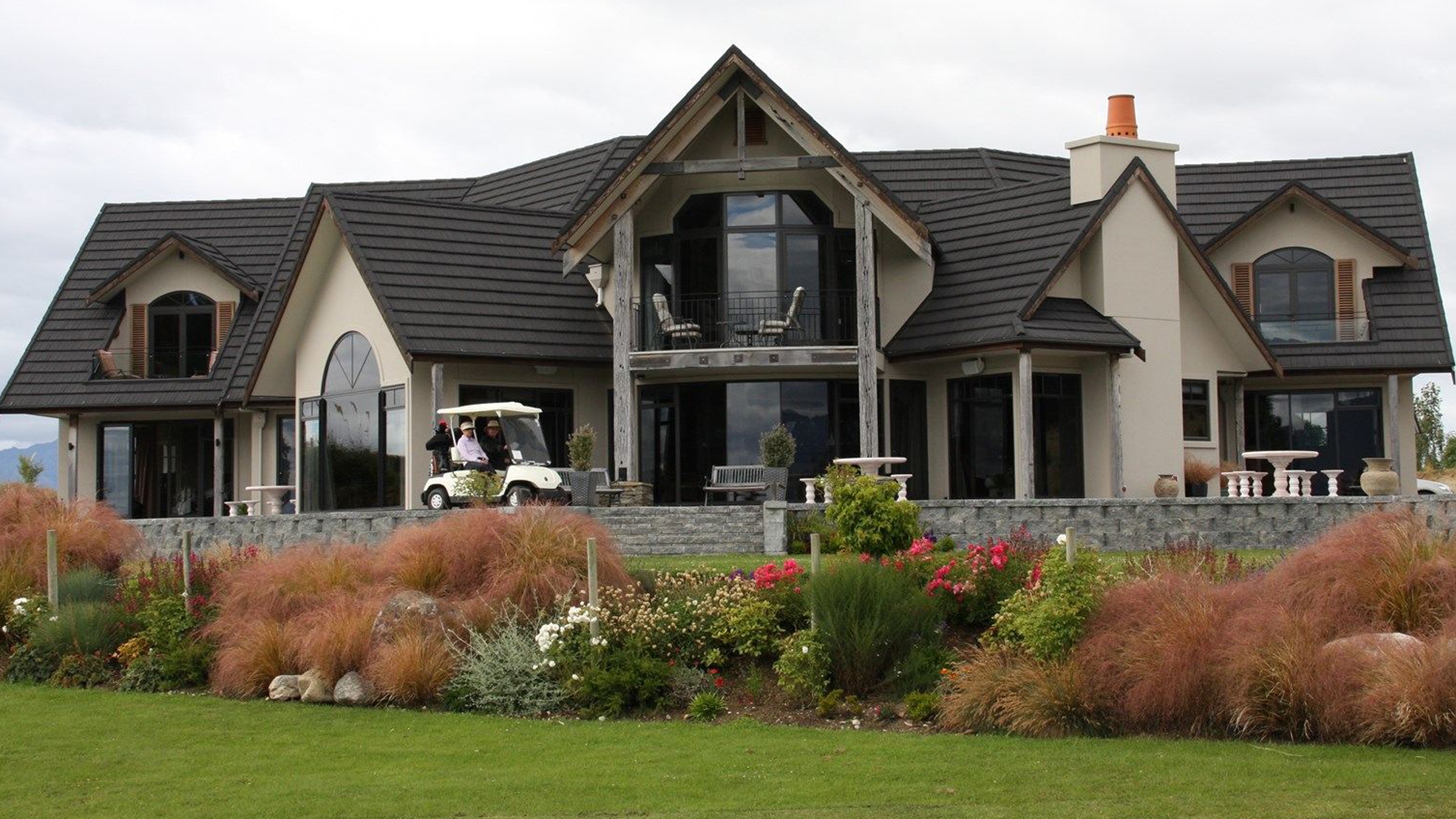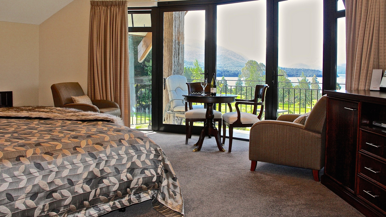 There are just five suites, three of which have private baclonies. The main guest lounge features an open fire and a living and dining area with views over the golf course, Lake Te Anau and the mountains of Fiordland National Park. There is also a library, gym, sauan and spa pool.