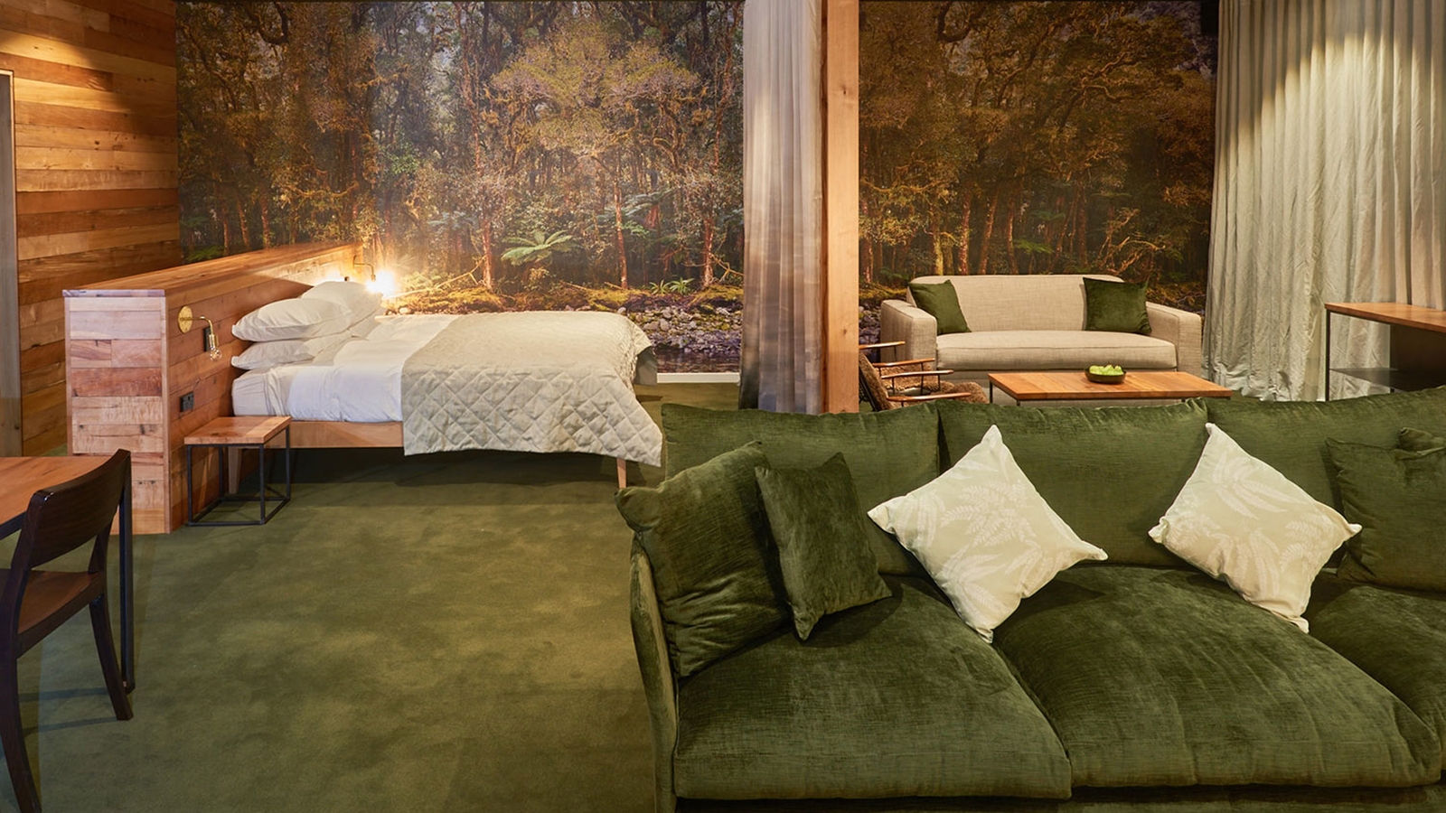 Rooms feature walls covered in forest panoramas and moss-green carpets and furnishings. The sleeping, dining and lounge areas are separated by slatted beechwood partitions and silk curtains.