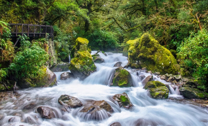 With the snowy-peaked Southern Alps sloping down into deep blue waters and lushly forested shores bursting with wildlife, the spectacular Fiordland National Park area in the south-western corner of the South Island is known for its stunning vistas.