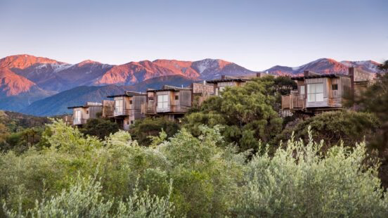 Surrounded by dramatic mountains near the South Island’s coastal town of Kaikoura, Hapuku Lodge & Tree Houses is a one-of-a-kind retreat. Rising 10 metres above a canopy of native kanuka grove are five luxurious tree house suites, made from responsibly sourced or recycled and salvaged timbers. Each treehouse looks out onto the estate’s mesmerising 1,600-acre deer farm, complete with grapevine-covered pergolas and a sparkling view of the Pacific Ocean.