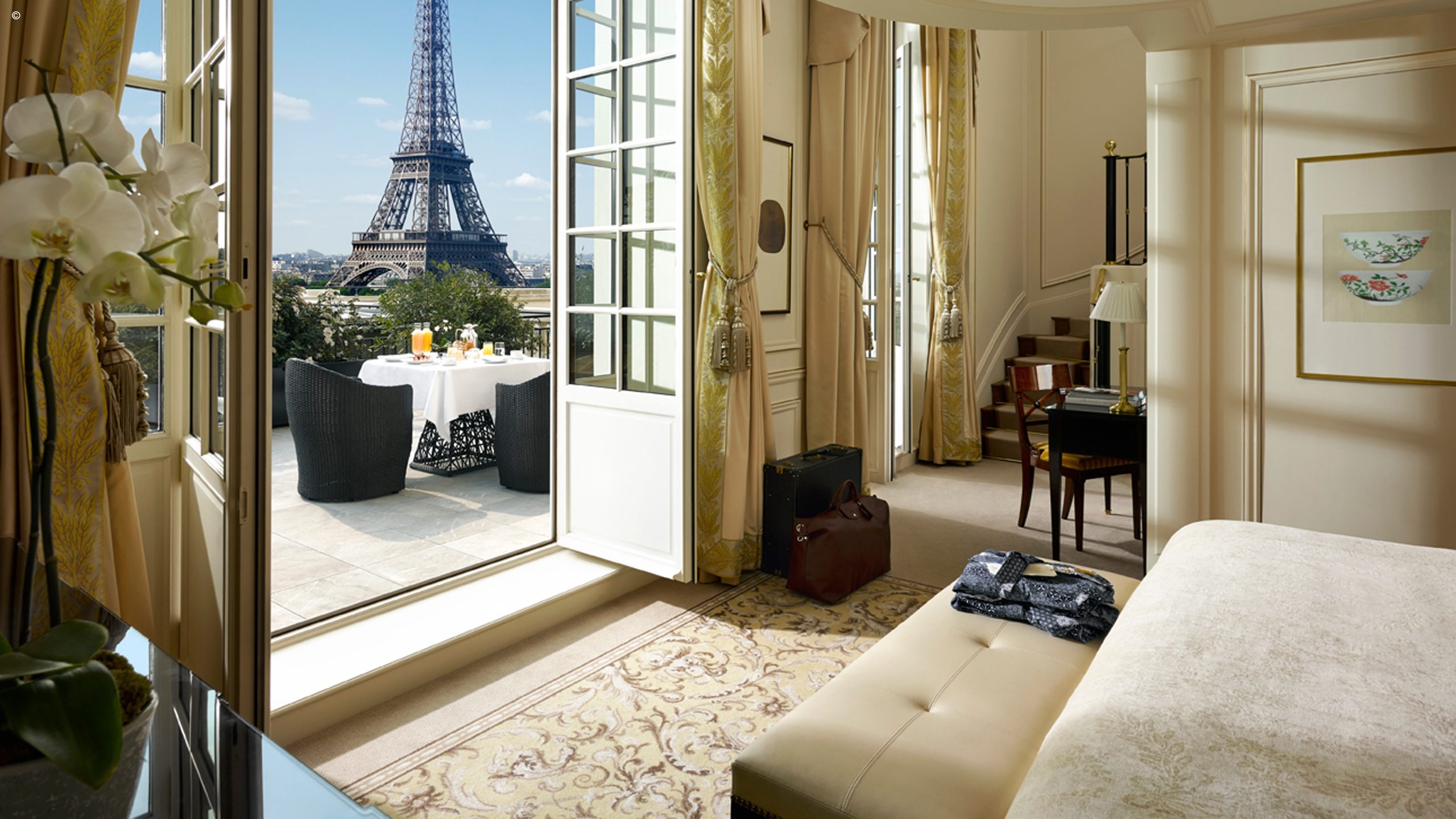 Beyond the elegant façade is a hotel that oozes old-world charm. The opulent rooms are decorated in soft shades of blue, white and ecru with silk-threaded wallpaper, textured panels and custom-made furnishings. Marble bathrooms come with underfloor heating, some offering views of the Eiffel Tower from the bathtub.
