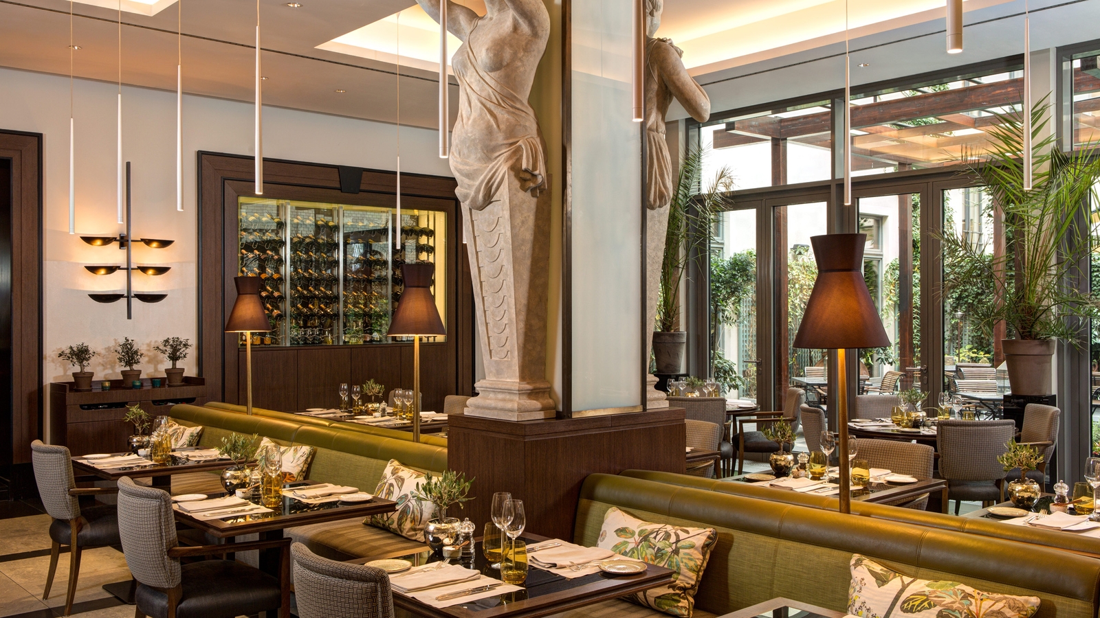 Upon arrival, the ground-floor reception serves as a striking entrance, with pink neon birdcages hanging from the ceiling and roomy black velvet sofas set alongside cherry-red furnishings. The refined interiors of the rooms and suites are somewhat more neutral, apart from pops of colour and vivid art paintings. High stucco ceilings and marble bathrooms add to the sophisticated atmosphere, and the polished suites encompass balconies, looking out over the square.
