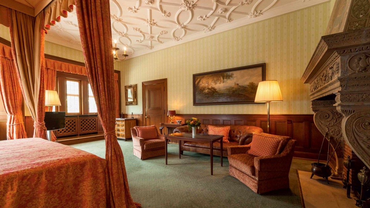 A fine dining experience can be sought after at the Castle Restaurant, a chandelier-lit arrangement of wooden panels and sweeping curtains revealing an outdoor terrace, ideal for feasting in the summer months. Jimmy’s Bar, with an American theme, is a moody bolthole of leather seating, overlooked by stately portraits and traditional afternoon tea is served in the polished lounge.