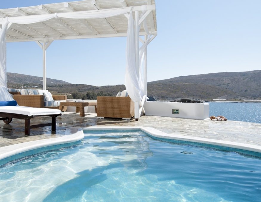 Each room and suite is curated with natural materials, handcrafted Greek artwork and a colour palette inspired by he surrounding sea, sand and olive groves. Some feature private pools, while others open onto terraces that frame uninterrupted views of the horizon.