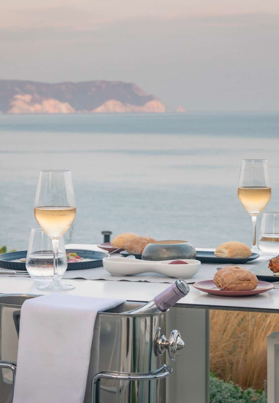 Each room and suite is curated with natural materials, handcrafted Greek artwork and a colour palette inspired by he surrounding sea, sand and olive groves. Some feature private pools, while others open onto terraces that frame uninterrupted views of the horizon.