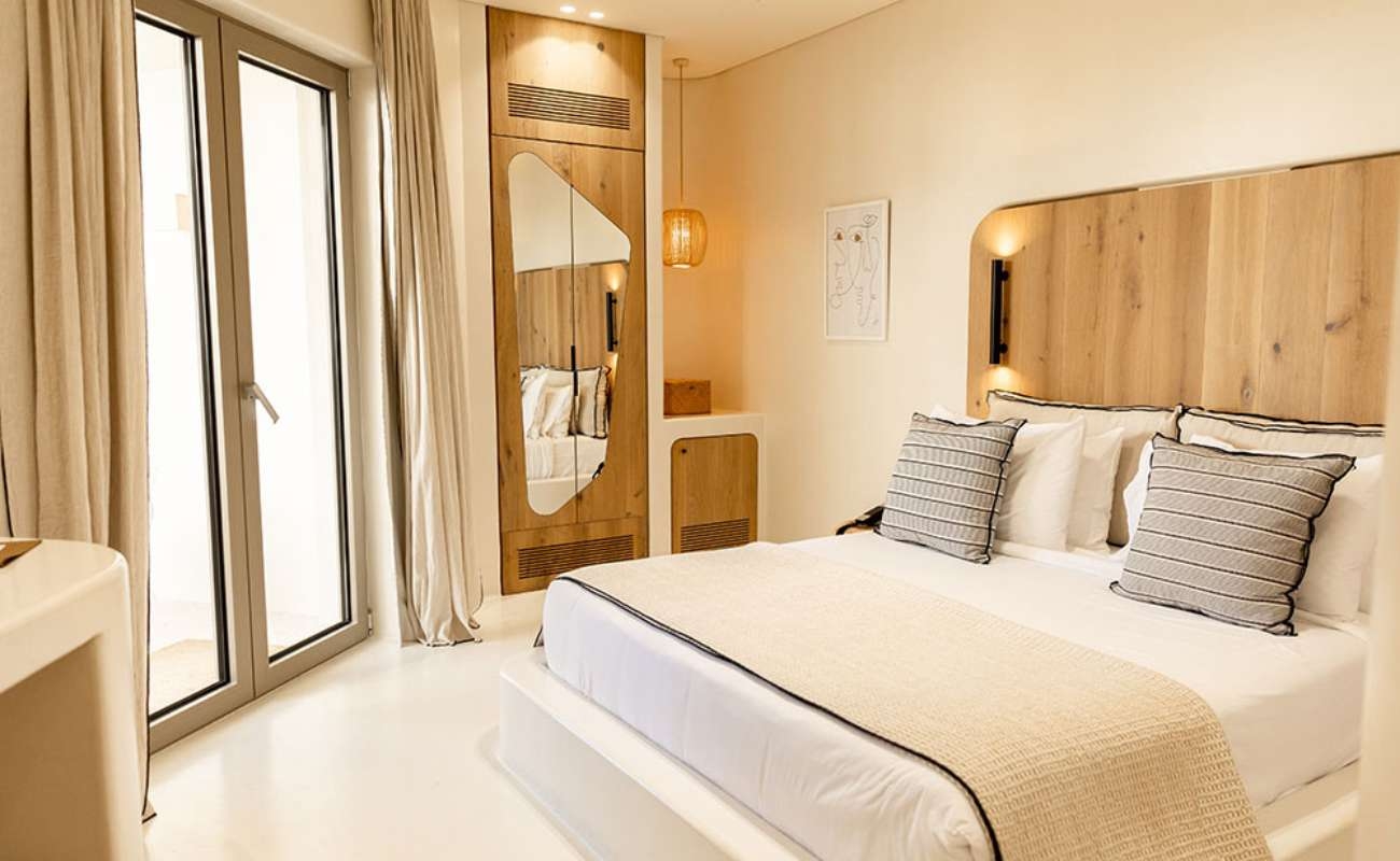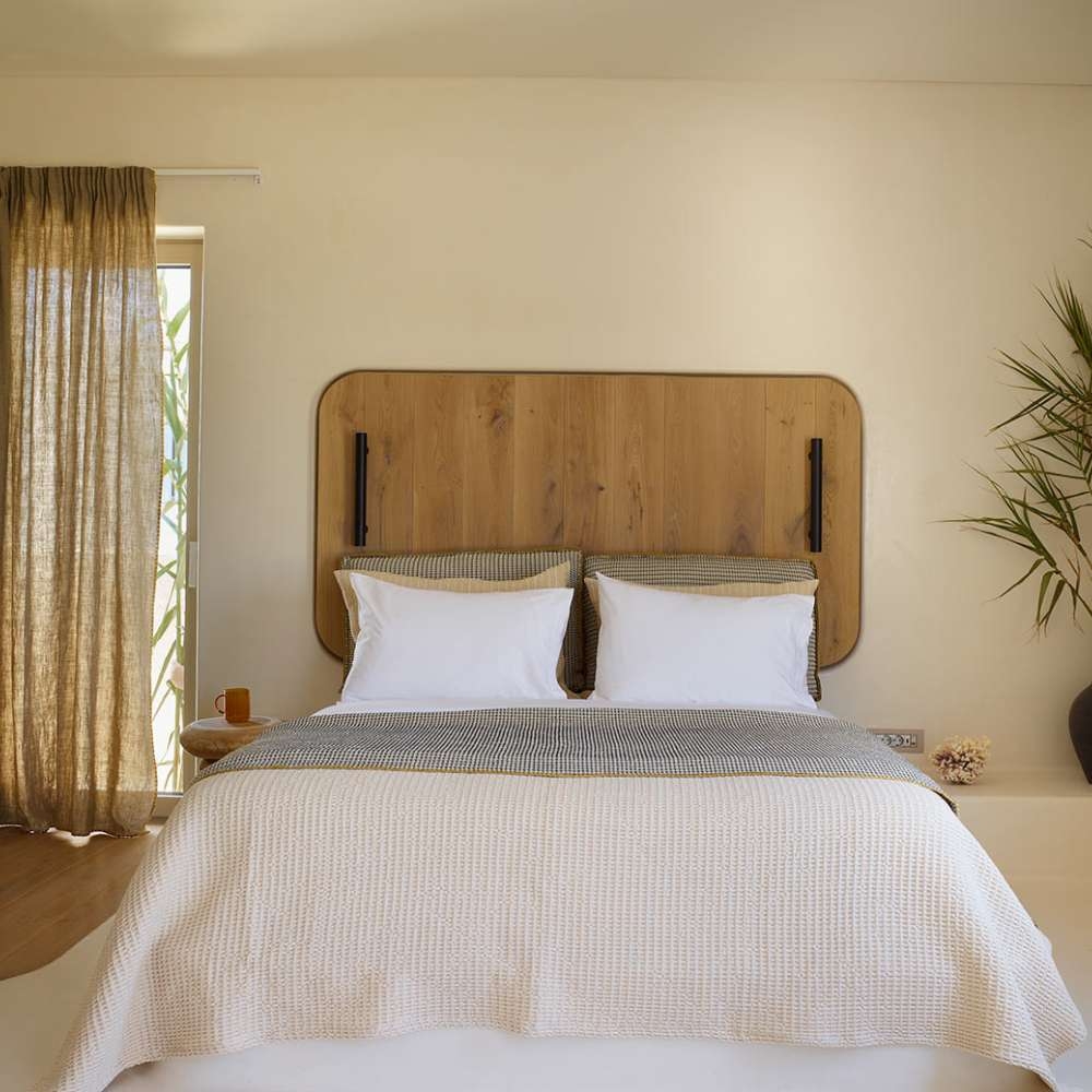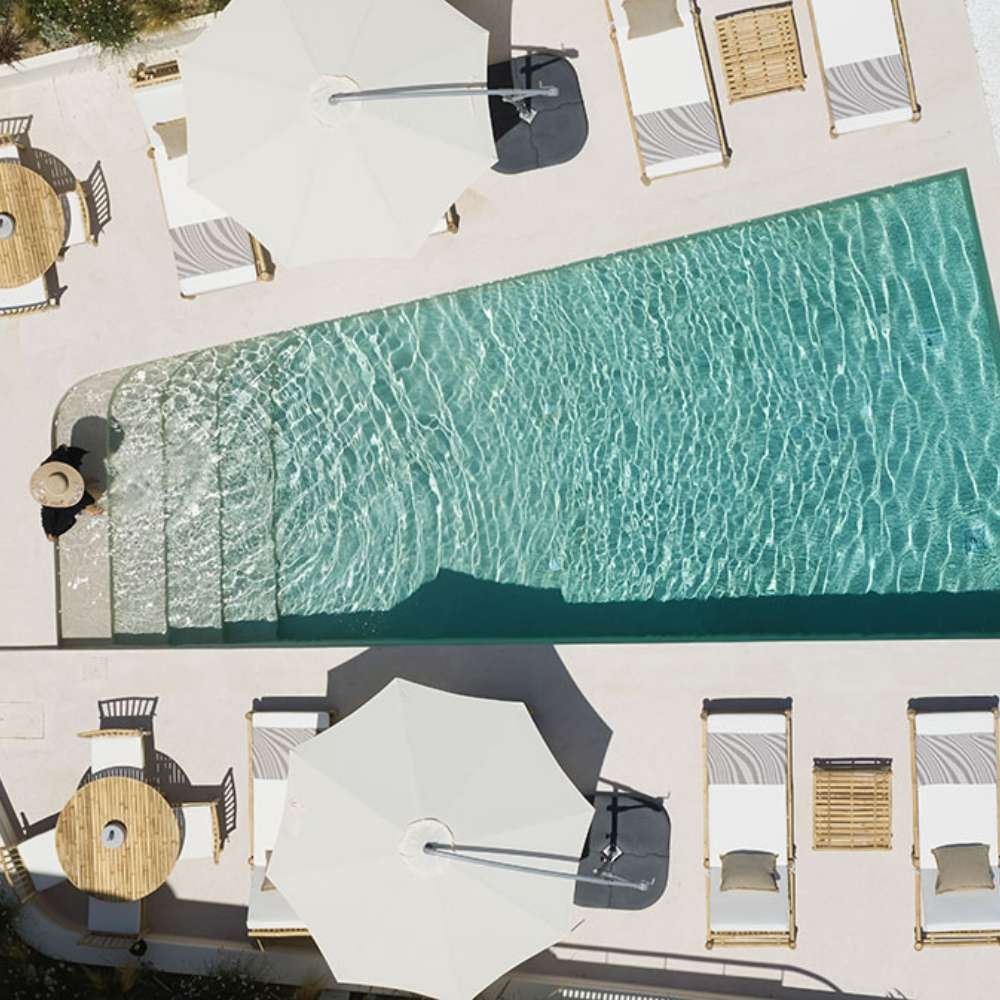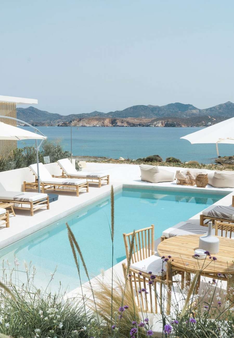 Blending traditional craftsmanship with contemporary design, White Pebble Suites blends into its beautiful beachfront surroundings in the coastal village of Pollonia. Created using local materials, like polished cement, cool marble, and warm wood, this boutique hotel is sympathetic to the timeless architecture of the Greek islands. There are 12 suites at the hotel over 3 different categories, all with private terraces to soak up the sea views and 8 suites have their own private plunge pools. Screened by fragrant borders of Mediterranean plants, the couple friendly suites emerge organically from the surrounding landscape with smooth curves and pale colour palette. Tactile glassware and ceramics, and earth-toned textiles create an ambience of easy-going warmth and effortless luxury.