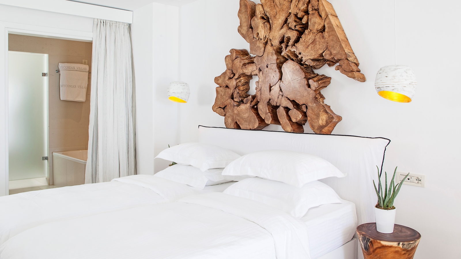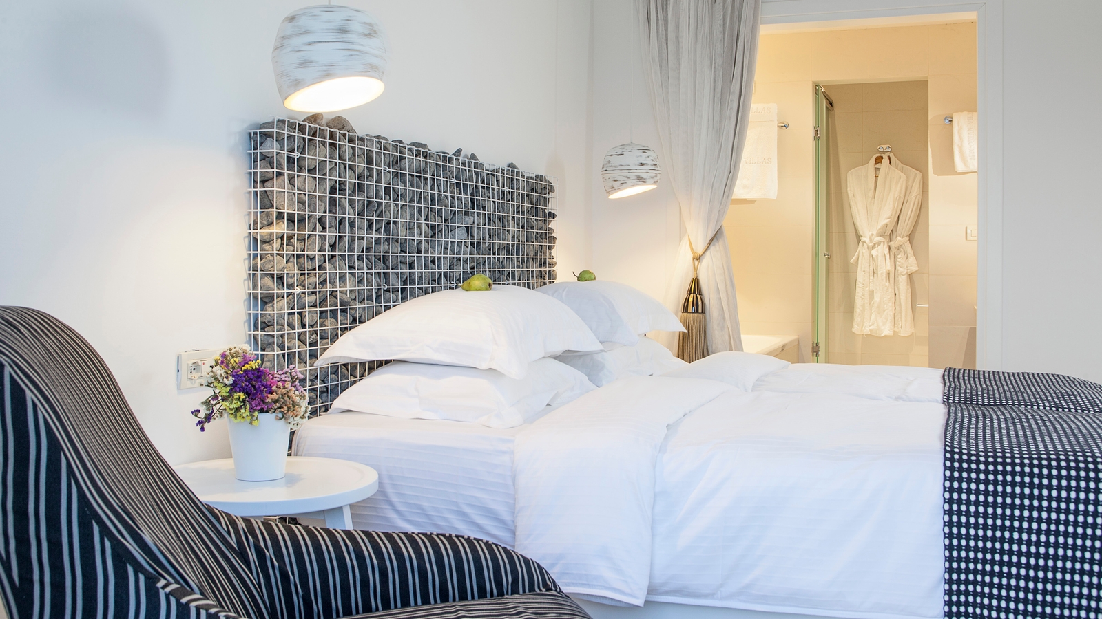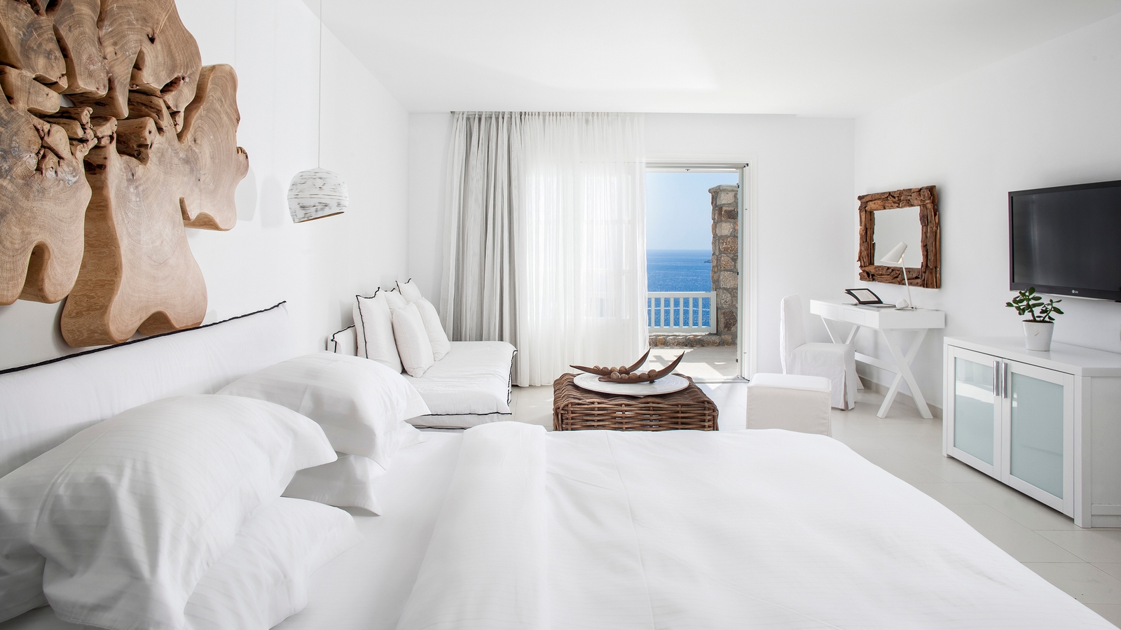 The 110 rooms are understated and elegant, and the design is inspired by the island’s heritage. Enjoy panoramic views of the Aegean Sea and Elia Beach from your private balcony or terrace, or unwind in a seawater infinity pool or Jacuzzi. Rooms are spacious and include all the modern features you would expect from a luxury resort.