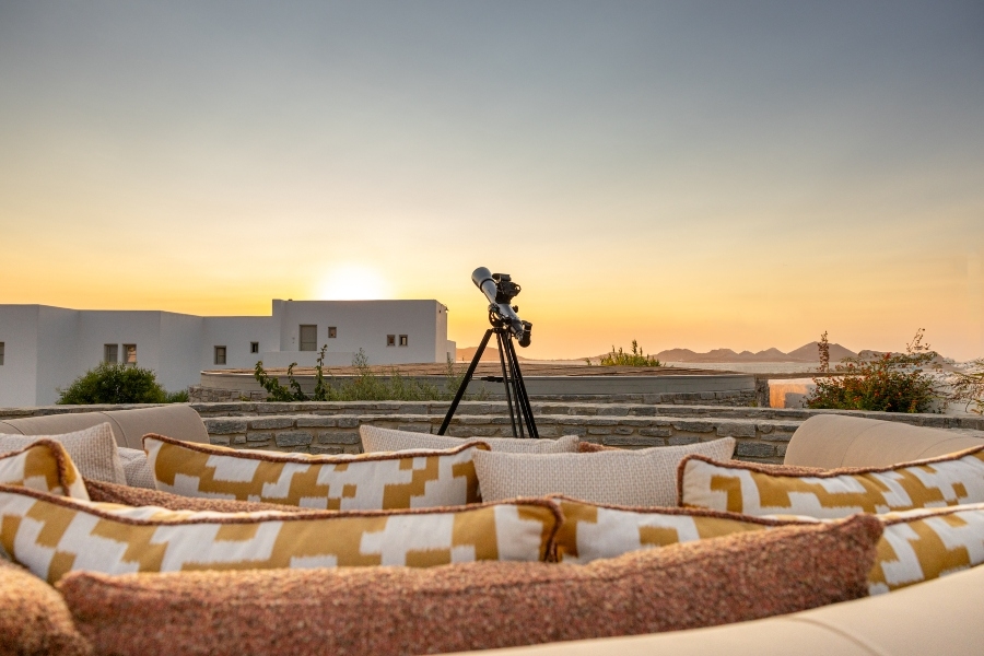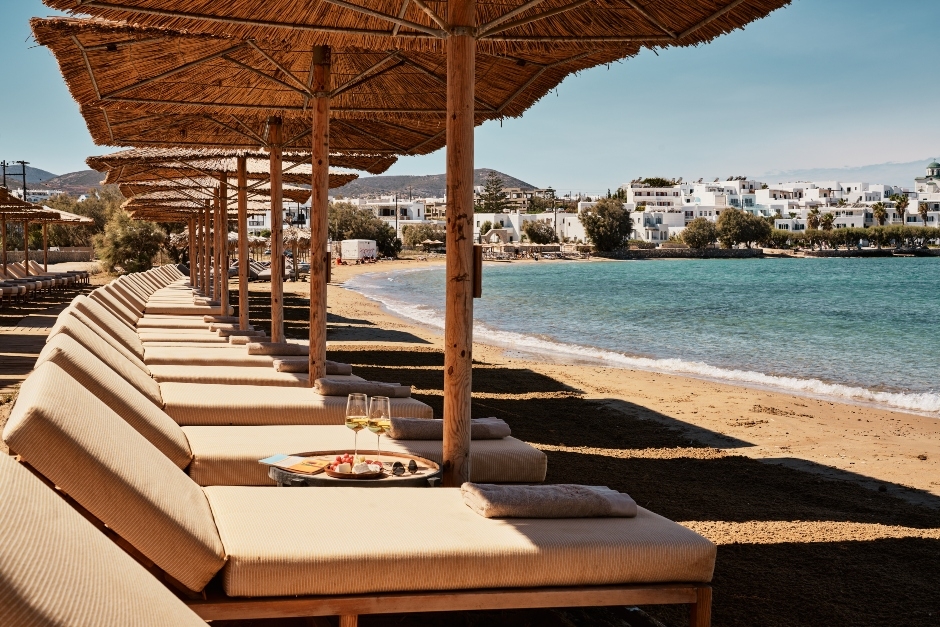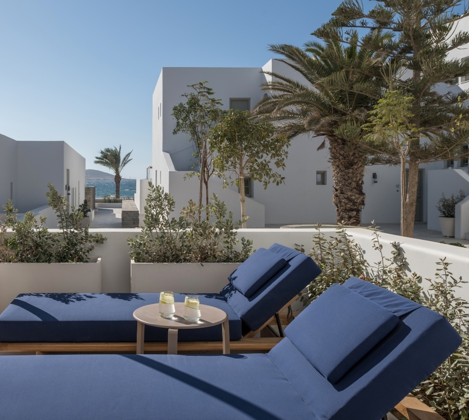 The hotel also boasts its own beach club where you’ll spend days basking in the sunshine with your feet in the sand on the hotel’s own comfortable loungers with parasols for shade. Rejuvenate your senses in Cosme’s Elios spa with a signature treatment or a dip in the Jacuzzi. The hotel’s location means you can easily visit the picturesque little village of Naouss to explore its restaurants, bars and winding cobblestone streets.