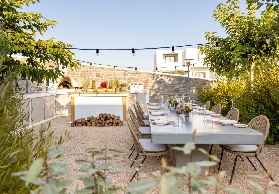 For dining, Volta Restaurant serves delicious breakfasts every day. Enjoy Parostià restaurant’s location overlooking the beach and shimmering sea as you savour delightful and traditional Parian cuisine. There is also the open-air setting of Vrosi, where you’ll indulge in exquisite traditional Greek recipes lovingly prepared using the finest local ingredients, all the while surrounded by the aromas of rosemary and lavender from the Cycladic garden.