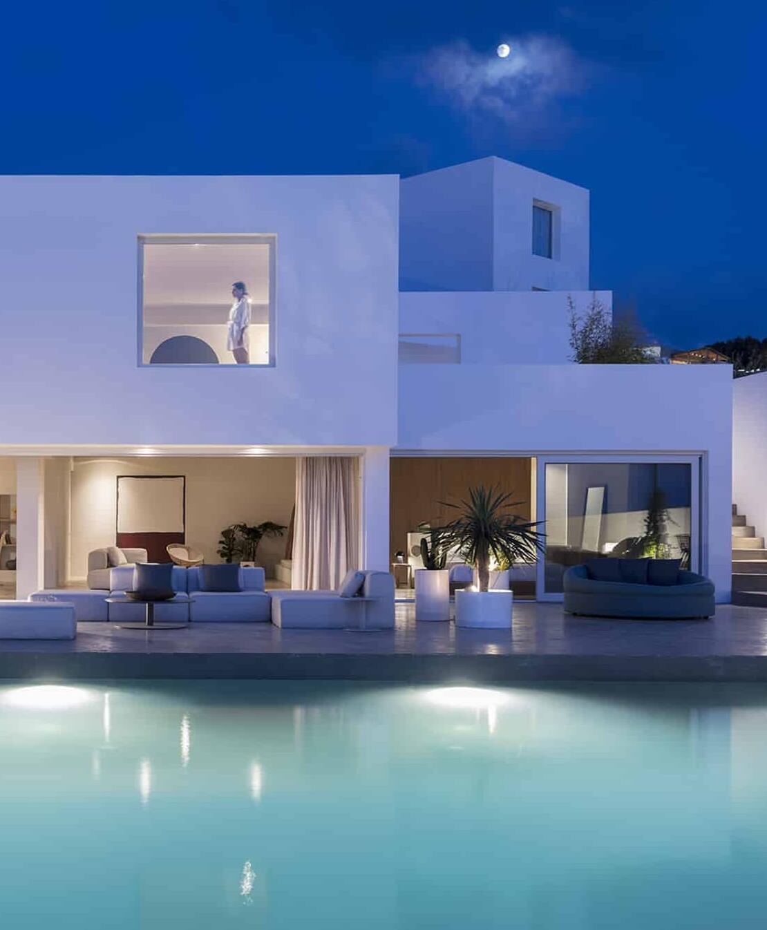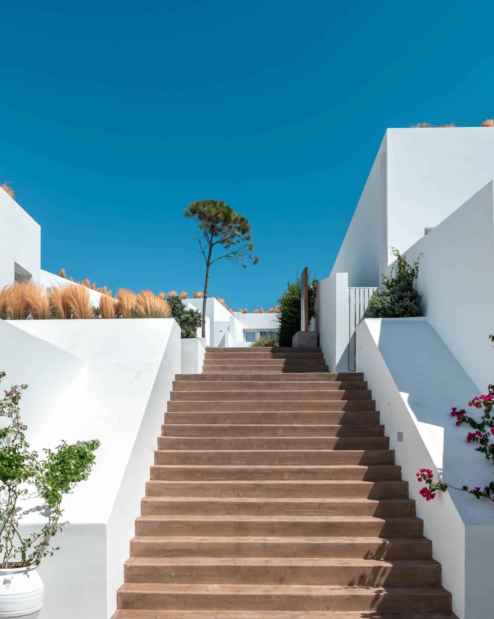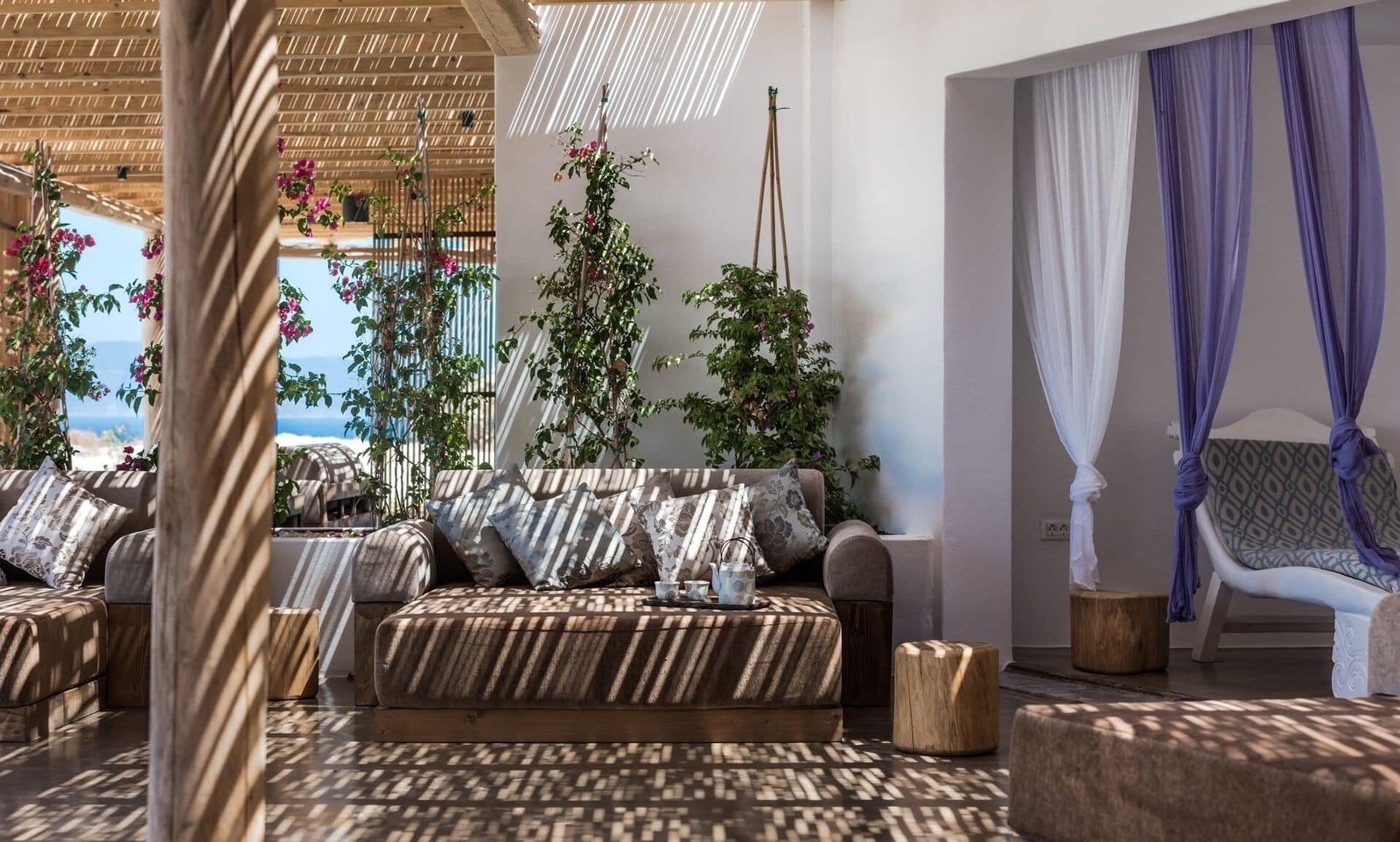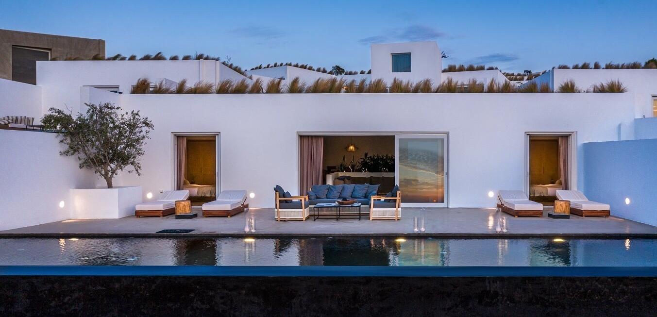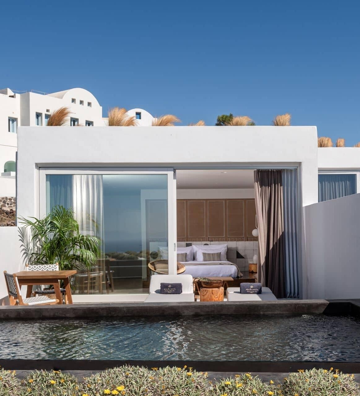 Each room and suite is curated with natural materials, handcrafted Greek artwork and a colour palette inspired by he surrounding sea, sand and olive groves. Some feature private pools, while others open onto terraces that frame uninterrupted views of the horizon.
