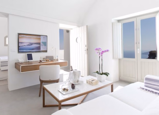 Each room and suite is curated with natural materials, handcrafted Greek artwork and a colour palette inspired by he surrounding sea, sand and olive groves. Some feature private pools, while others open onto terraces that frame uninterrupted views of the horizon.