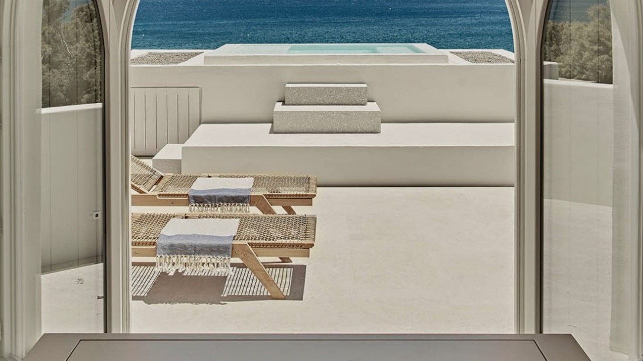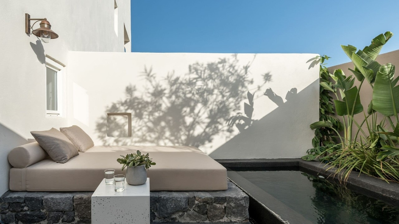 The hotel’s pool is impressively large, made with a spectacular green artisan tile work, ensconced within protective walls and surrounded by inviting sun loungers and to one side is the statement sunken pool bar. Mr. E Restaurant serves delicious Greek dishes, often reimagined but always instilling a splendid simplicity that suits the fresh, local ingredients. They serve an abundance of local seafood – best savoured with a glass of sublime Santorinian wine. The energy and dedication to wellness and tranquillity is summed up perfectly at the serene Elios Spa. Here guests can enjoy a range of treatments, pampering and a soak in the relaxing jacuzzi.