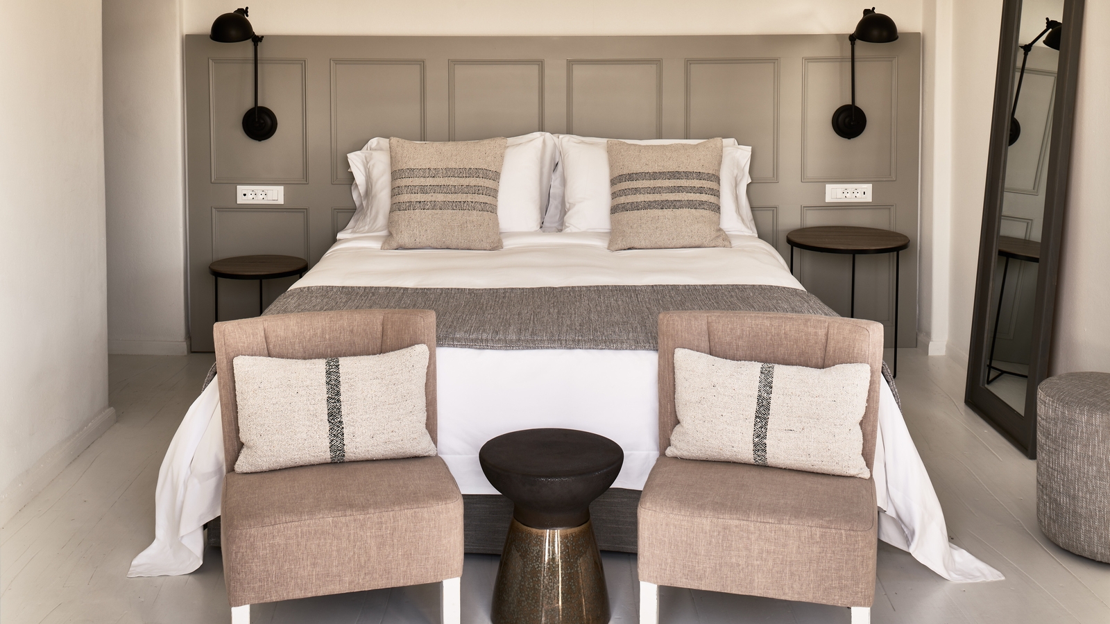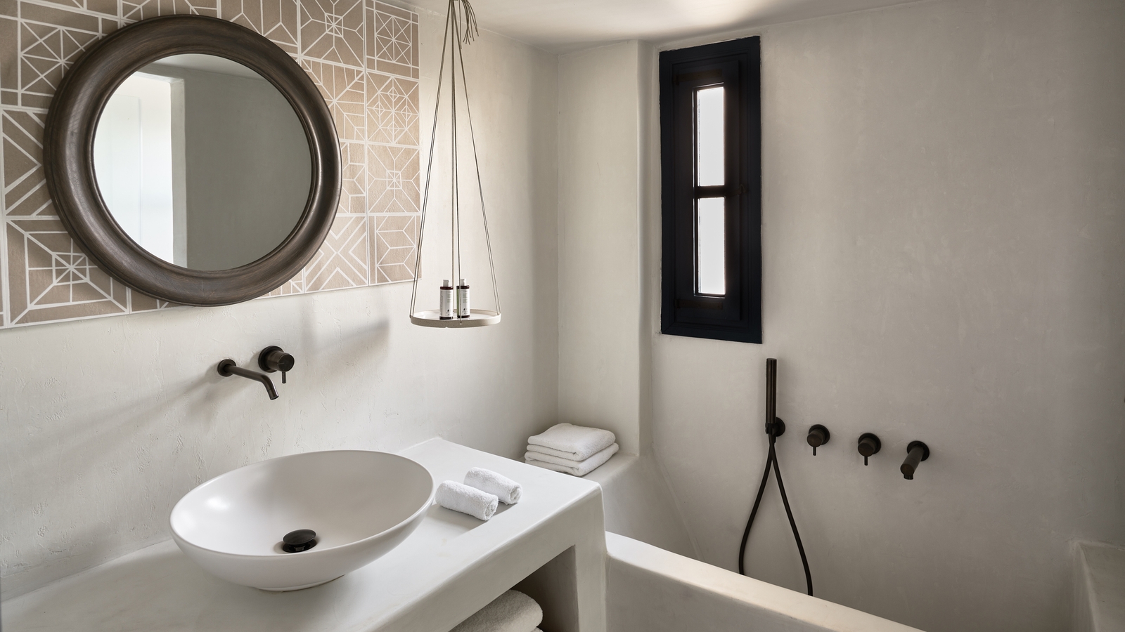 Each room and suite is curated with natural materials, handcrafted Greek artwork and a colour palette inspired by he surrounding sea, sand and olive groves. Some feature private pools, while others open onto terraces that frame uninterrupted views of the horizon.
