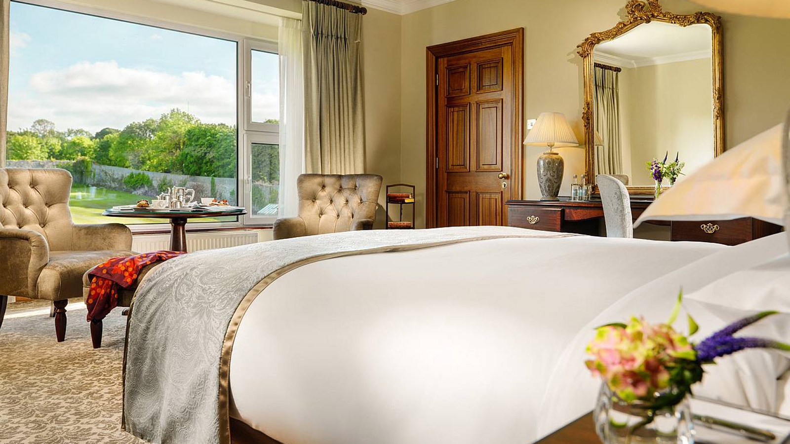 The 46 bedrooms and suites evoke a wealthy 19th century manor and are all vastly spacious, some with uninterrupted views of the dramatic West of Ireland landscape and some with views of the River Corrib, Lower Lough Corrib, Connemara, and the 18th Century Abbey and Walled Garden.