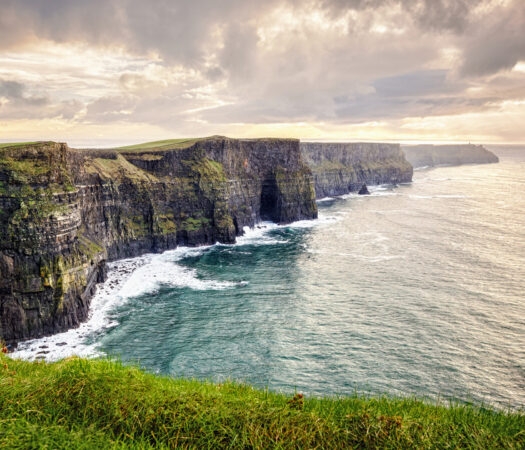 The Cliffs of Moher are among the country’s most impressive sites, with 14 kilometres of staggering cliffs plunging down into the ocean. Near their highest point you can visit O’Brien’s Tower, which gives you even greater views of the nearby mountains, the Aran Islands and the Loop Head lighthouse.