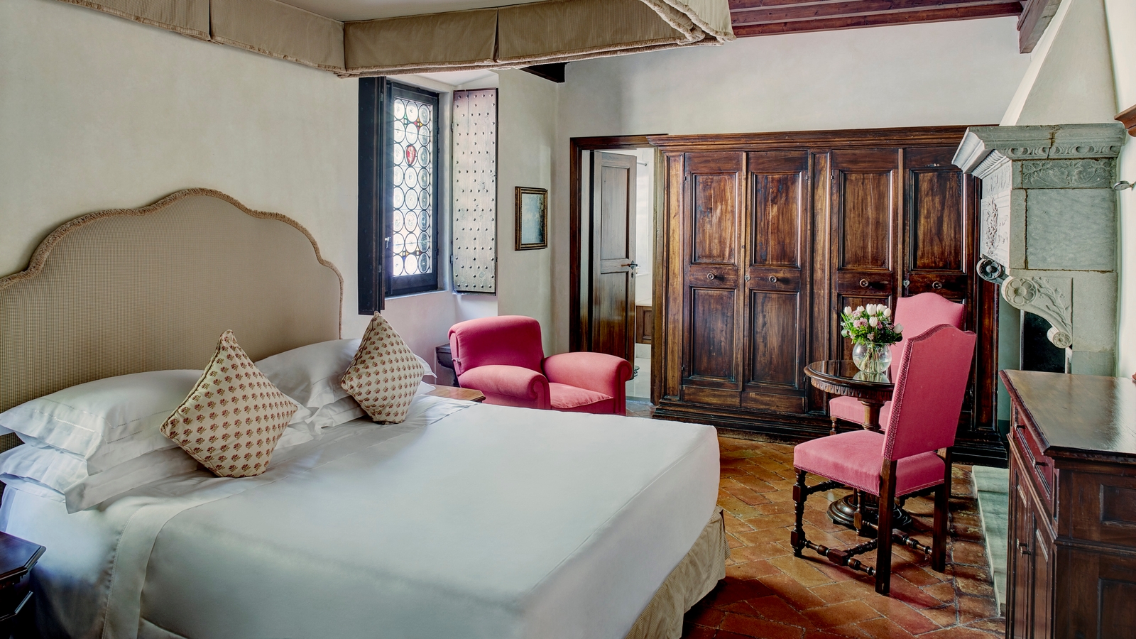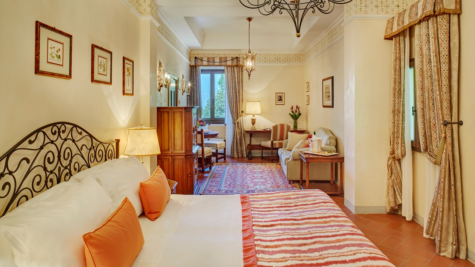 Each of the 20 rooms and 25 suites are unique, with sumptuous antiques, along with cotto-tile flooring and bright Florentine textiles. Separate from the main building, the exquisite Limonaia Villa contains three suites located in the convent’s former orangery, all with incredible views. These can be connected together to create perhaps the most glamorous villa in Tuscany, a unique haven for families and groups of friends, or for a special occasion such as a wedding or exclusive party.