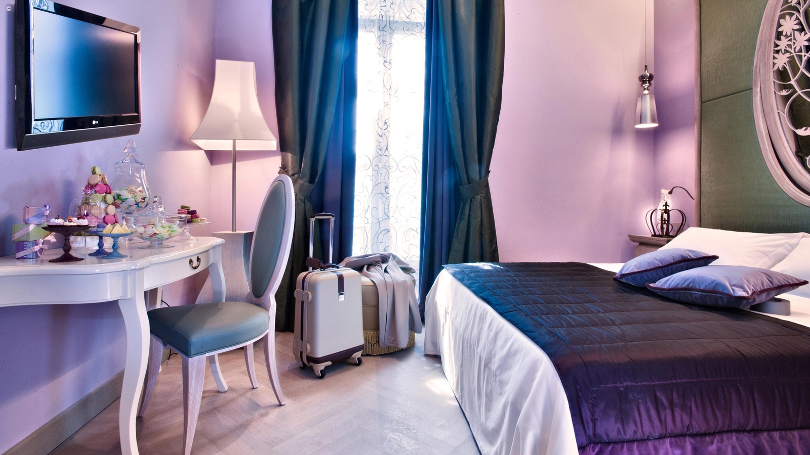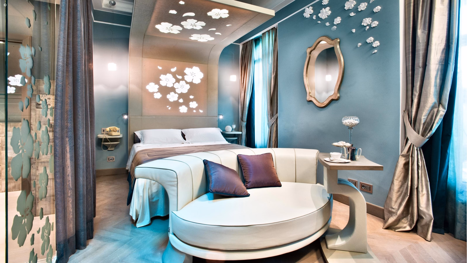 Located in the heart of the city, the hotel is housed within an early 20th-century art nouveau building, and draws its inspiration from the world of fairytales and opera. Pastel colors adorn the walls of the 77 rooms, enhanced by floral patterns and butterflies, mosaics on the floors, mirrors and princely alcoves.