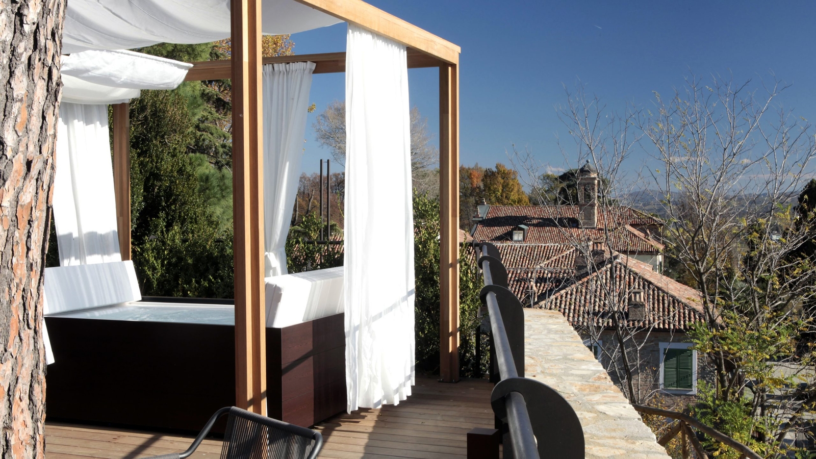 The outdoor swimming pool offers panoramic views of the Moscati vineyards and the Langa Hills, but for the ultimate in relaxation you’ll want to head to the spa. A real highlight, it has a wine hammam with a Jacuzzi filled with water and wine, and a sauna in the shape of a barrel.