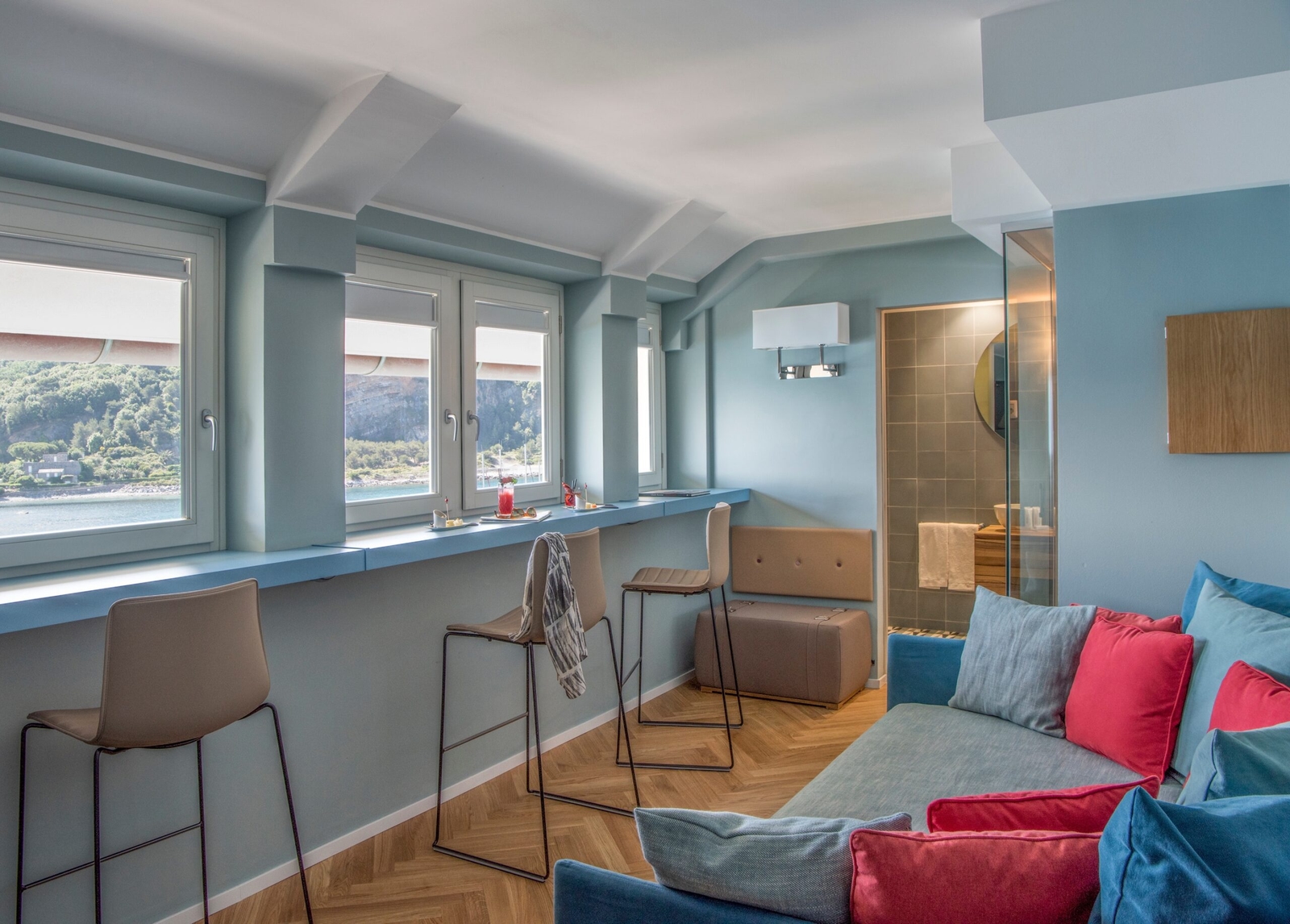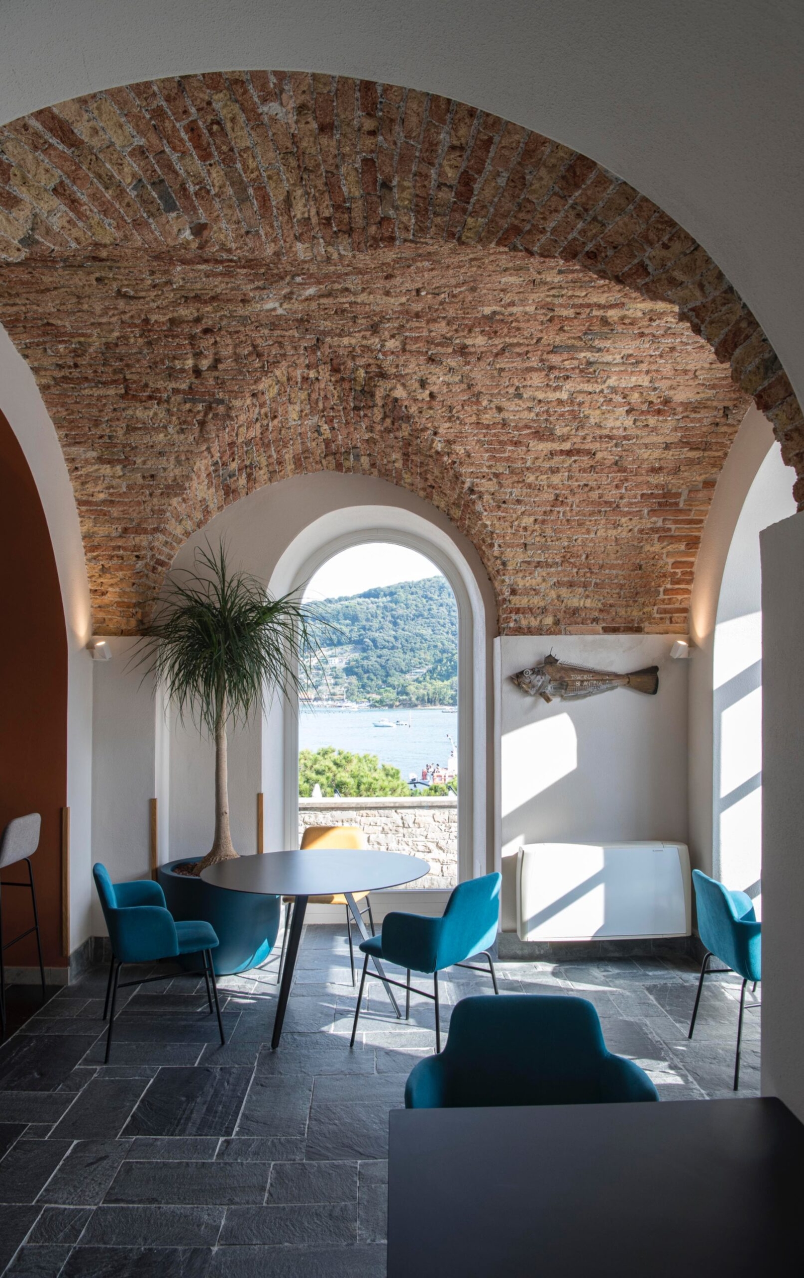 Many rooms open onto terraces or French windows, where morning light spills over views of Portovenere’s colourful harbour and the open Ligurian Sea. The interiors are simple yet sophisticated, blending the clean lines of modern design with subtle nods to the Renaissance monastery that once graced these walls.