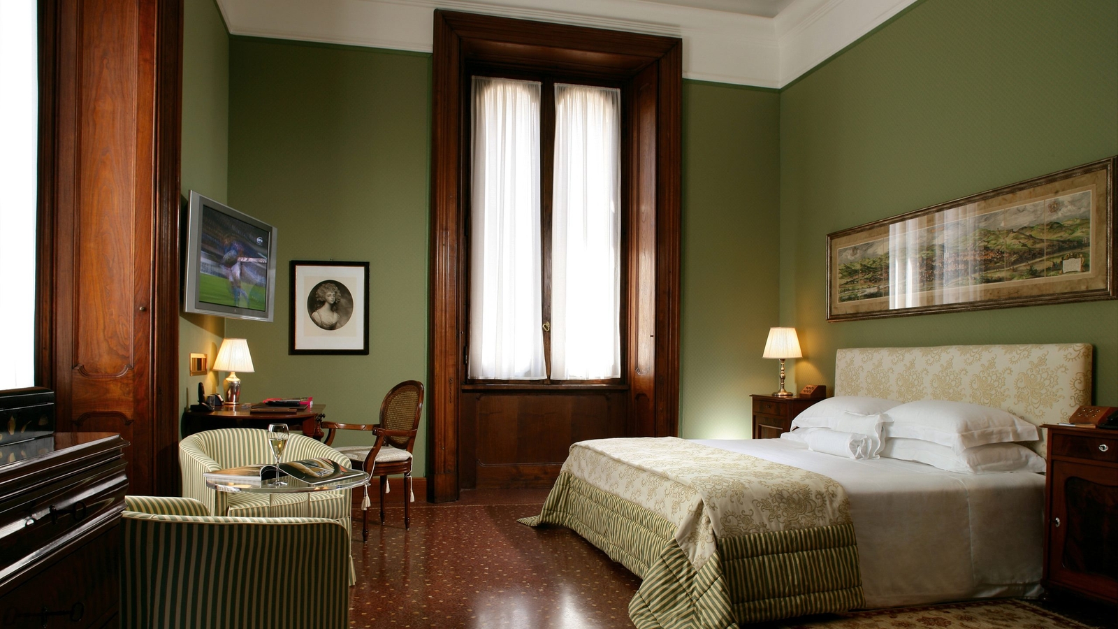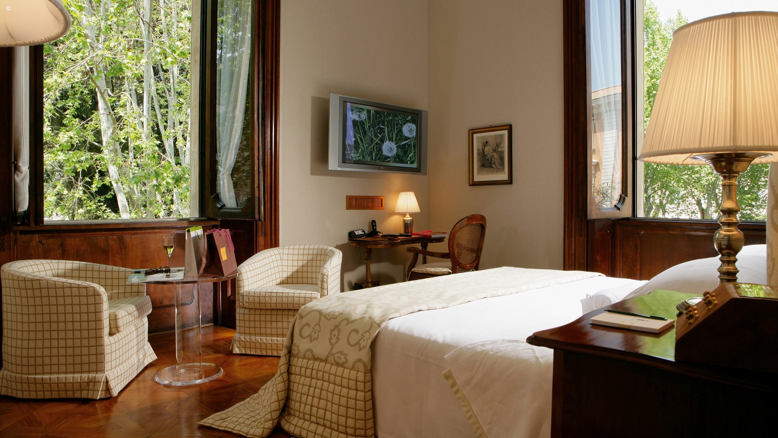 Overlooking the greenery are just 12 rooms, warm and welcoming, with subtle modern touches enhancing the historic charm of the original features. Large beds are clad in Fiandra linen sheets and alpaca or cashmere throws. Bathrooms are spacious and lined in marble, and all have baths as well as showers. Well-stocked minibars are complimentary.