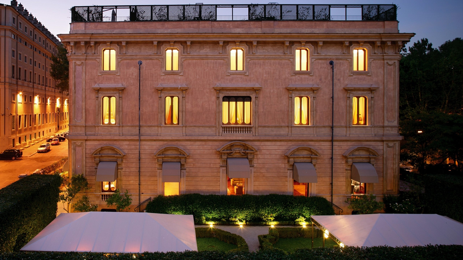 Communal areas are full of antiques and art, the library is listed and lounge areas steeped in a dark wood, old world luxury. Outside are peaceful formal gardens that form a walled oasis away from the Rome’s bustle.