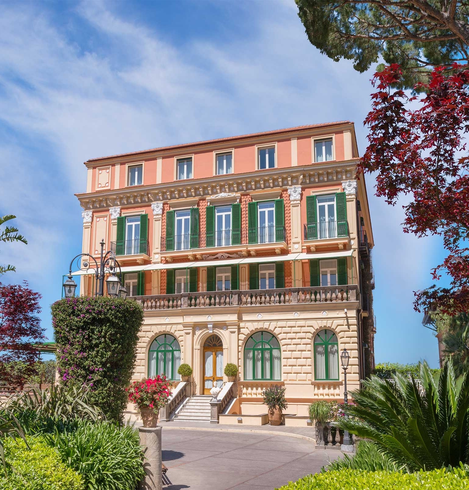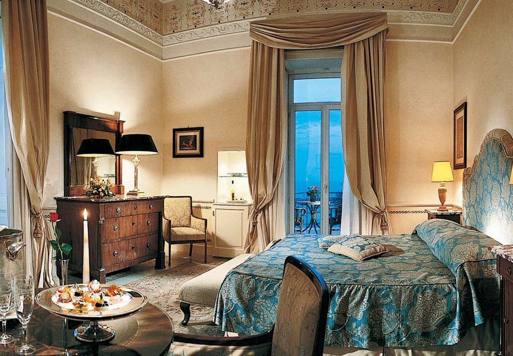 Propped atop a cliff, with a sweeping panorama of the Bay of Naples and Mount Vesuvius, this superbly presented resort centre dates back to 1834 and is ringed by a garden, awash with lemon trees and olive groves. An extraordinarily tasteful example of Belle Epoque architecture, Grand Hotel Excelsior Vittoria is a delightful composite of marble, plush furnishings, nude tones and arched ceilings.