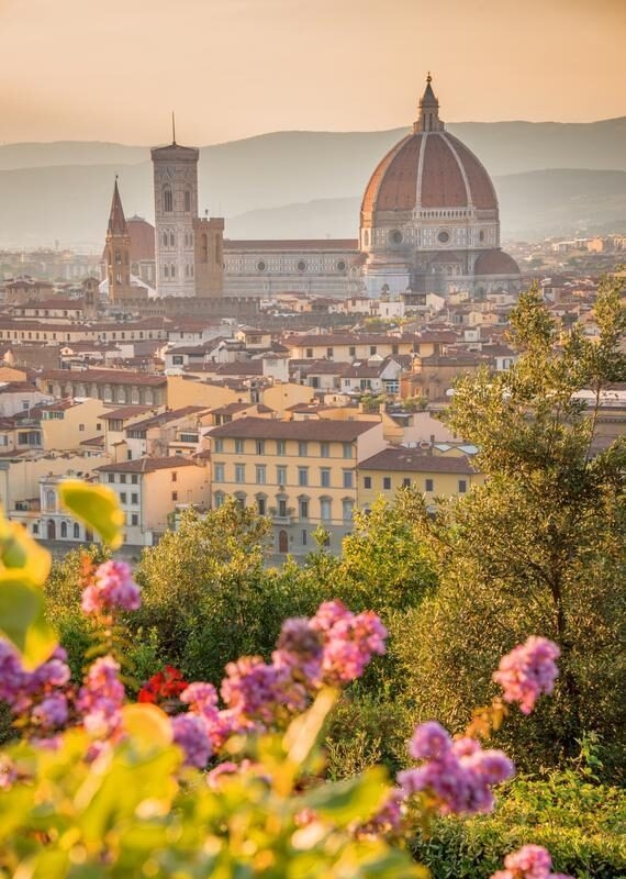 Santa Maria del Fiore, also known as the Florence Cathedral, is the centrepiece of a city renowned for its abundance of art. Its outside walls are decorated with intricate patterns of white, green and pink marble, as are those of the adjacent campanile and baptistery.
