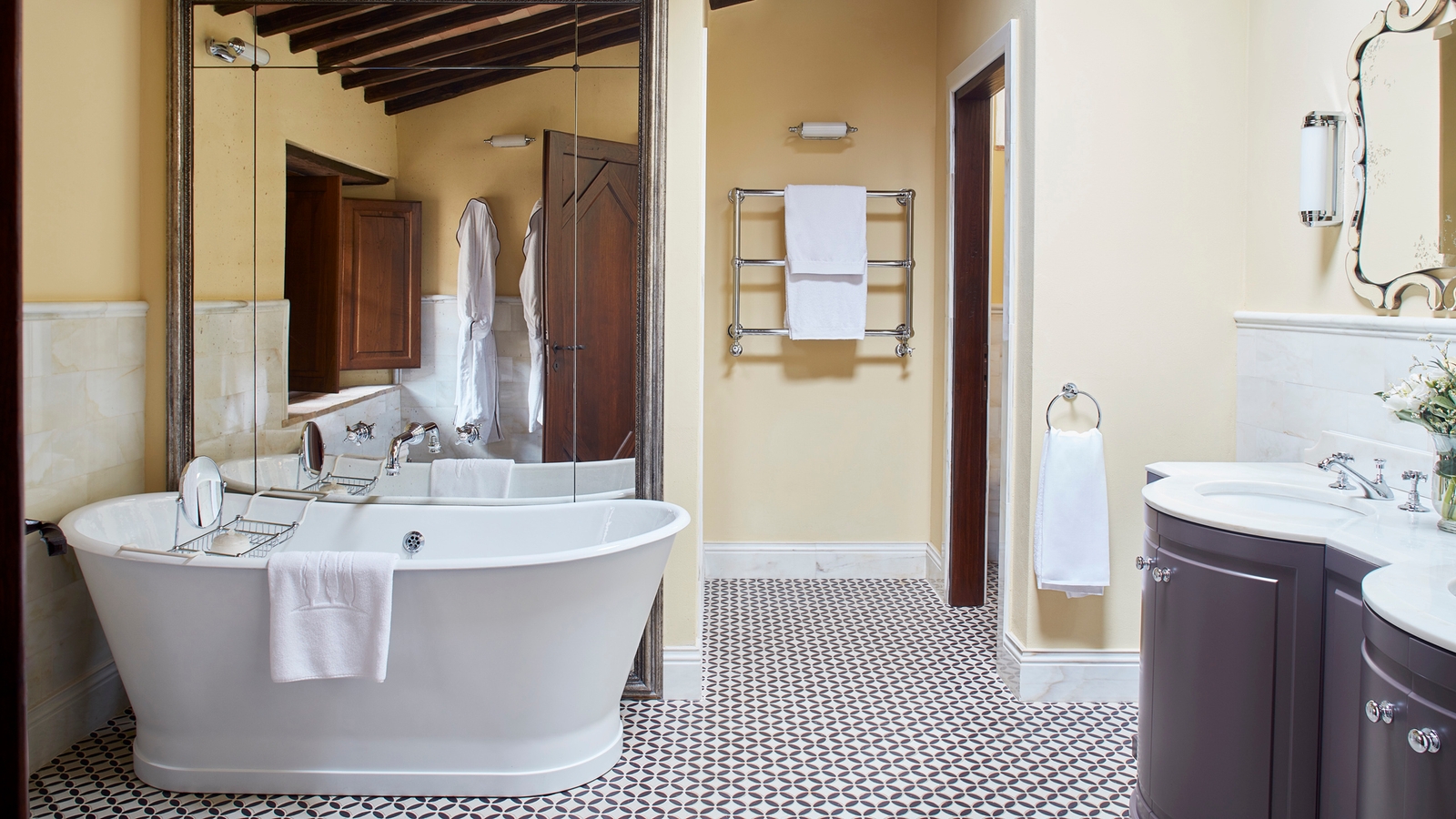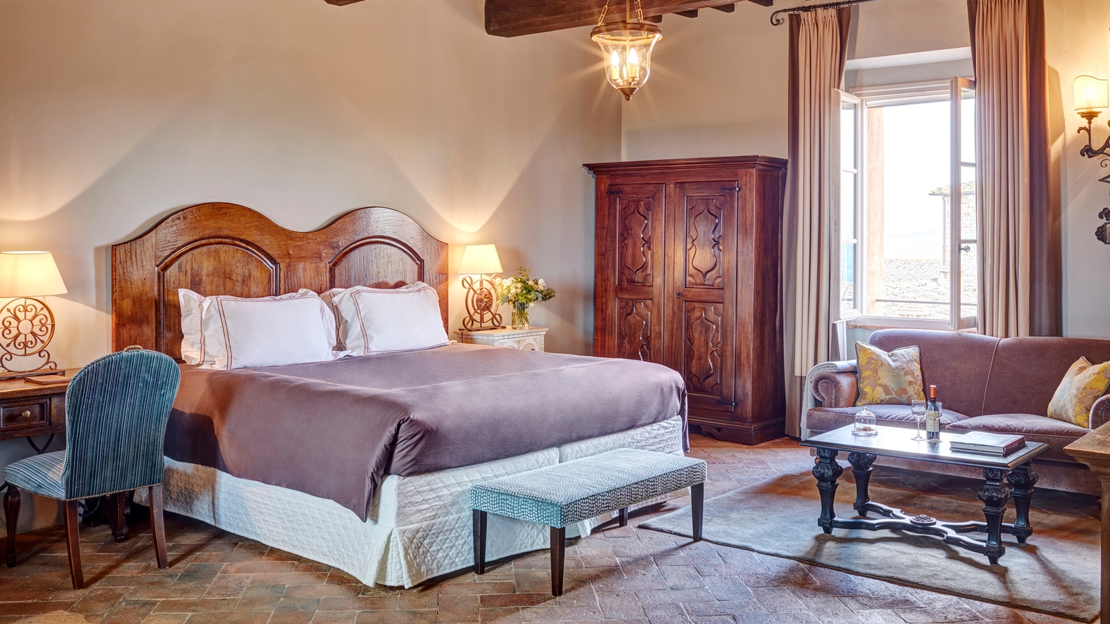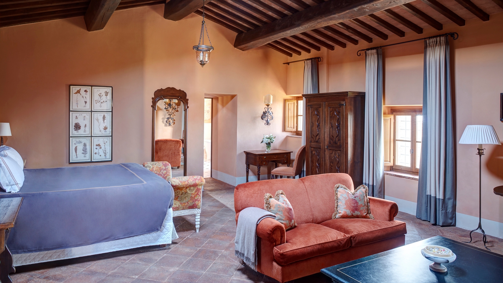 Despite its size, the castle has just 39 rooms and suites, giving it an intimate feel. Rooms have plenty of character with original wood-beamed ceilings and stone walls, luxurious fabrics and a mix of antique and contemporary furniture. Most have views of the Tuscan countryside, looking out over the estate’s vineyards and olive groves.