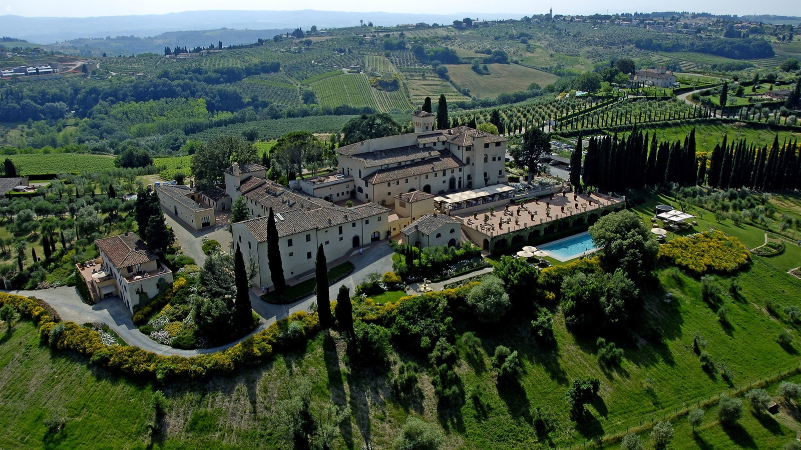 Each of the 50 rooms and suites look out over quintessentially rolling Tuscan countryside and the estate’s olive groves and vineyards that are frequented by pheasant, deer and wild boar.