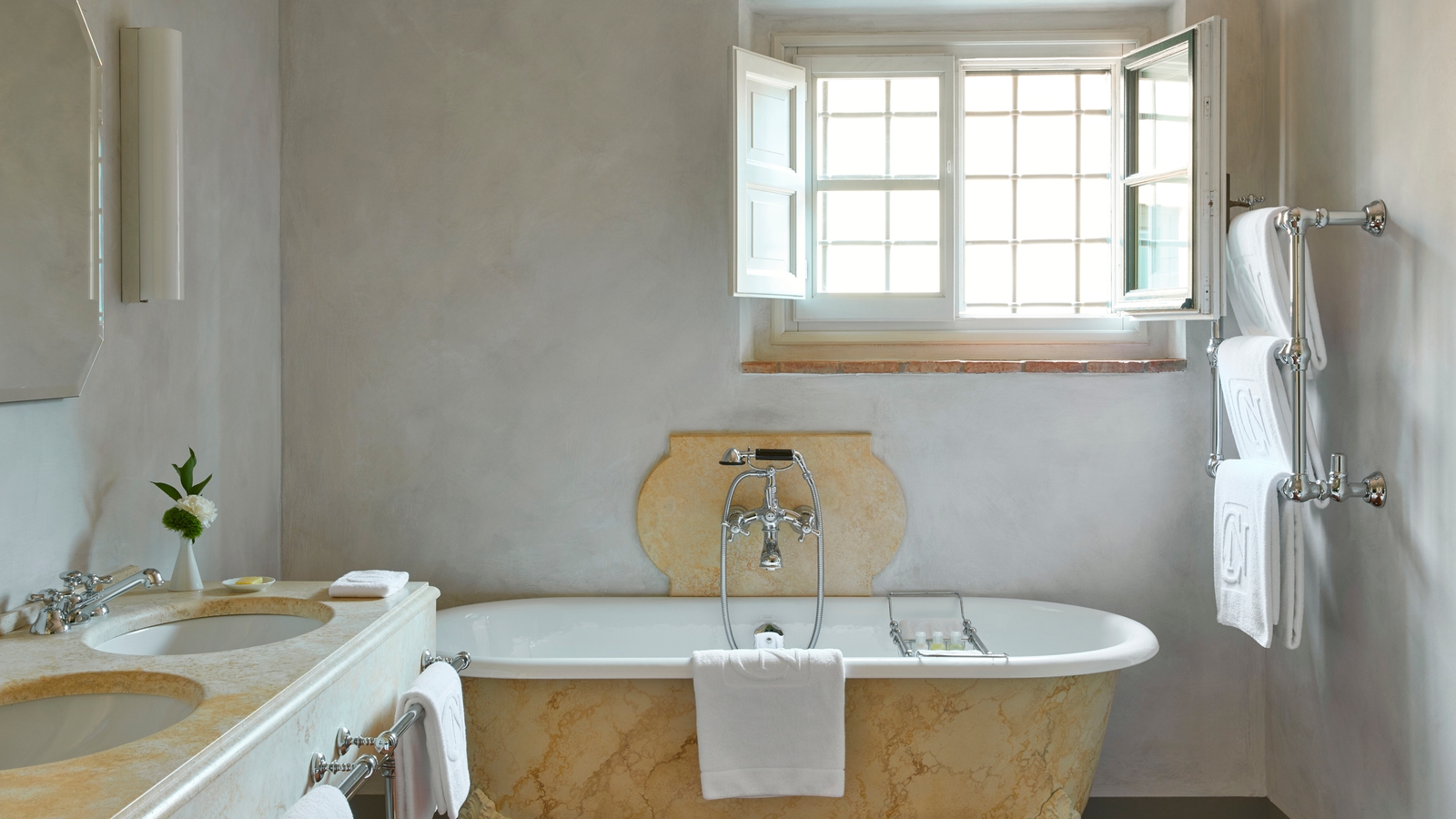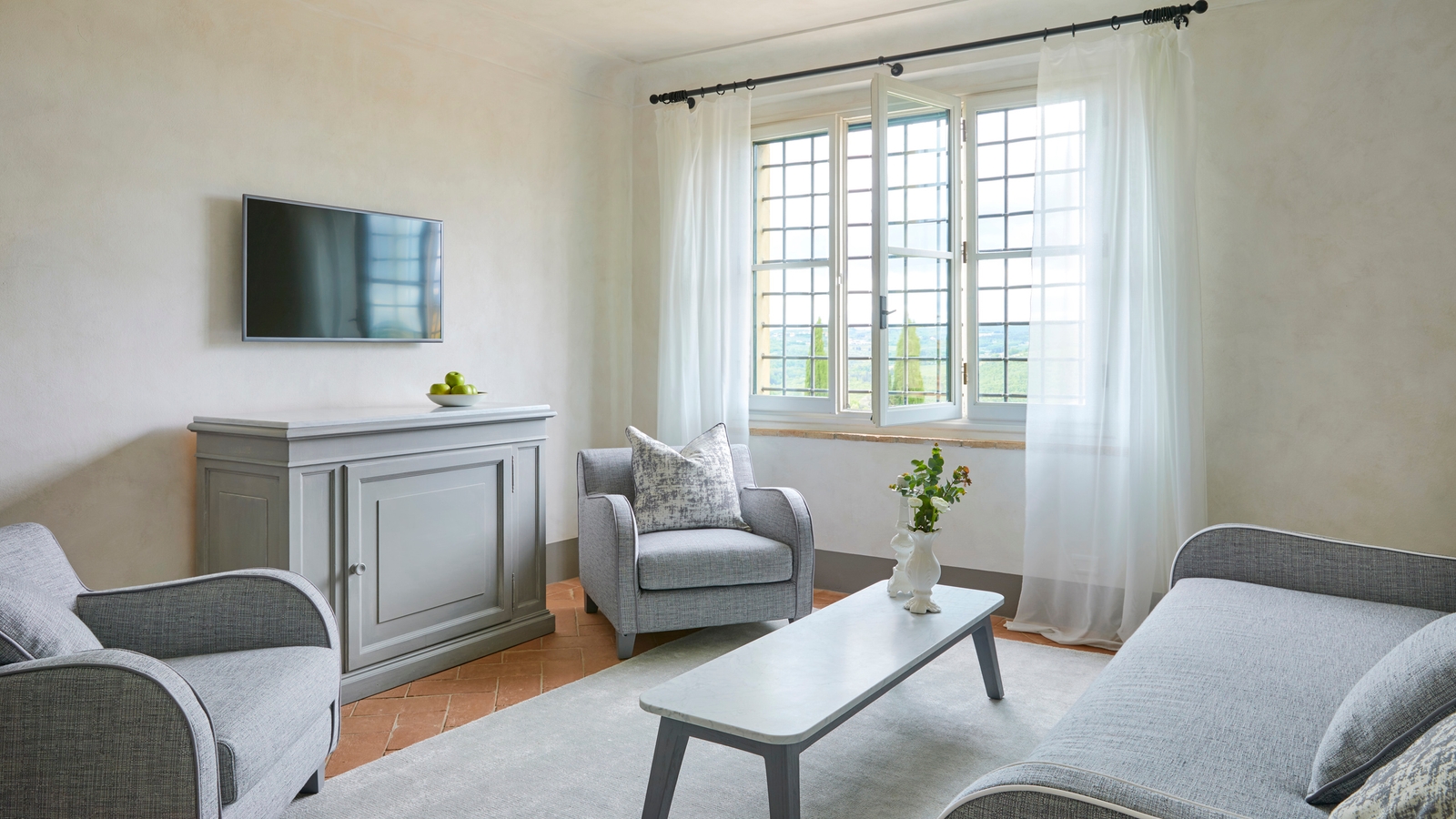Each of the 50 rooms and suites look out over quintessentially rolling Tuscan countryside and the estate’s olive groves and vineyards that are frequented by pheasant, deer and wild boar.
