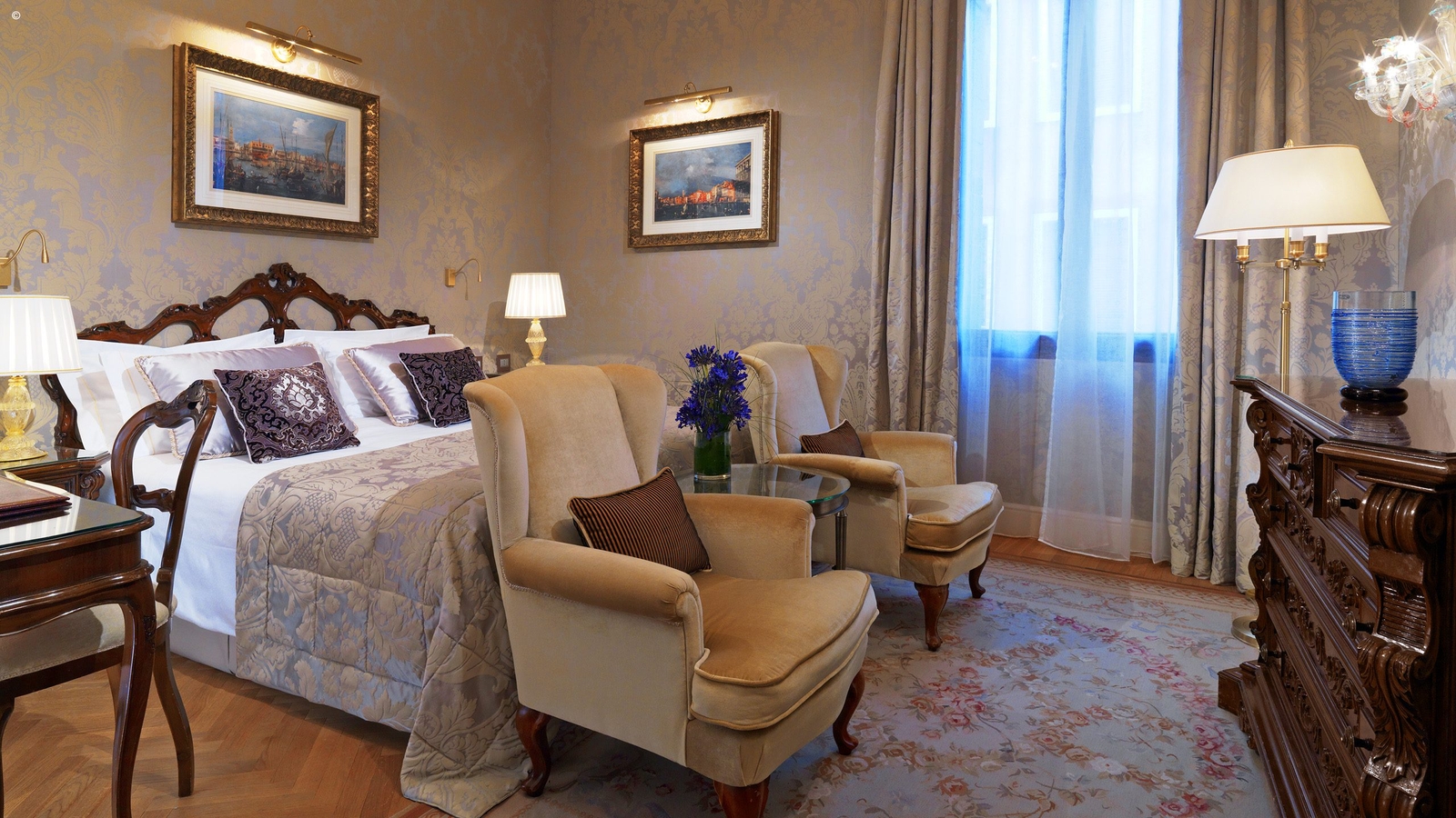 On entering the hotel you are welcomed by rich golds and reds, marble floors and beautiful tapestries. This classic décor is carried throughout the 210 rooms and suites which feature high ceilings, Murano glass lamps and large windows through which you can take in the views of the canal or the cobbled streets of the city.