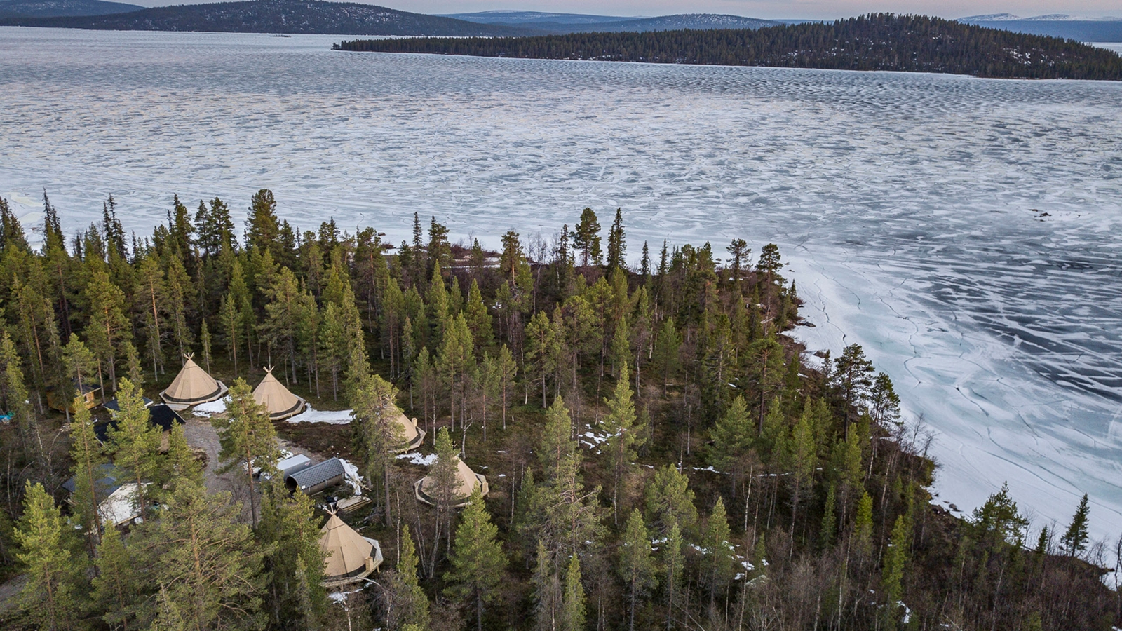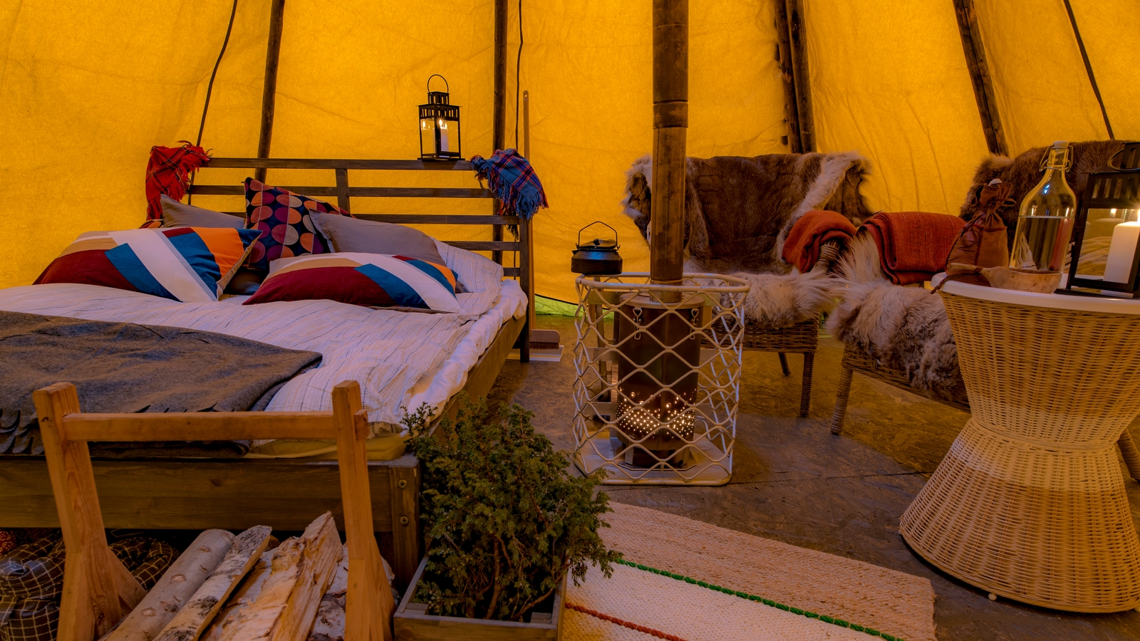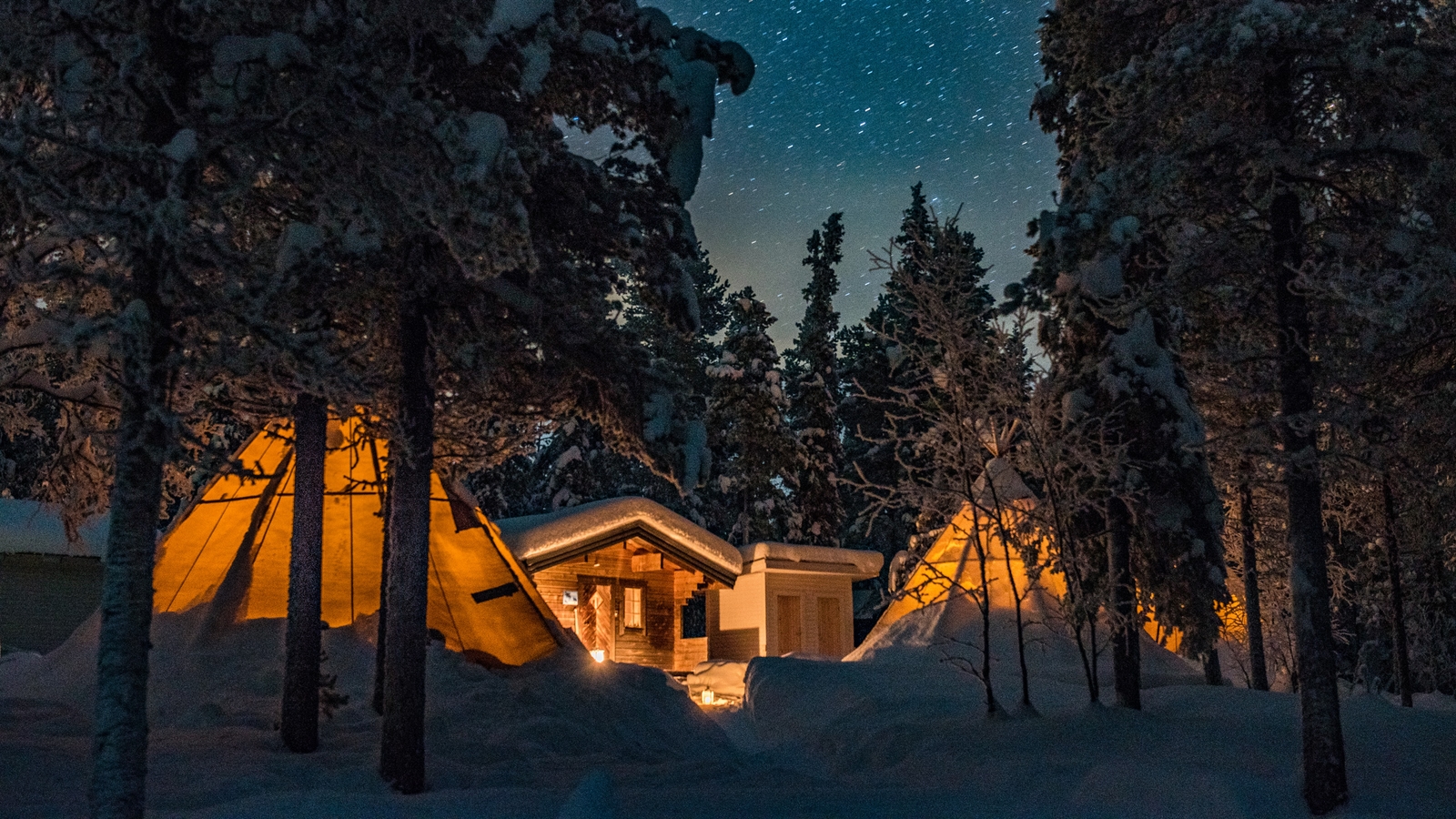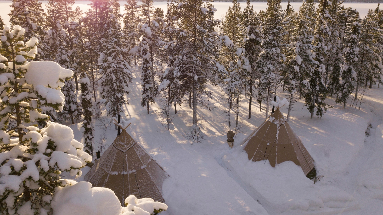 The camp consists of up to five traditional lavvu tents comfortably furnished with double beds, wood-fired stoves and simple Sami furniture, each stood on a wooden platform, spread out around a small cabin close to a central cabin with a dining room and warm outhouse.