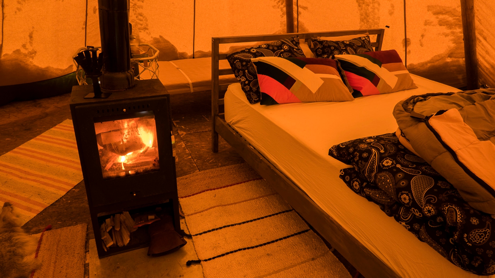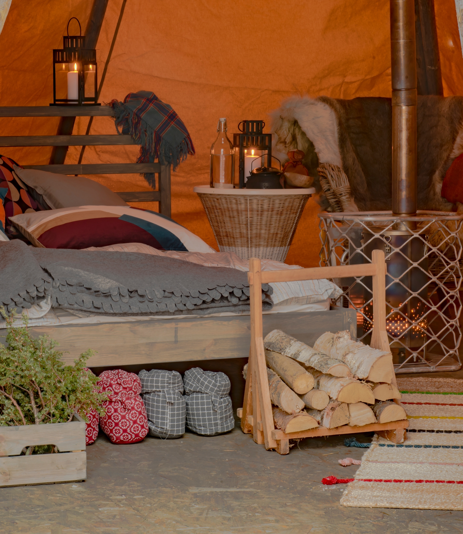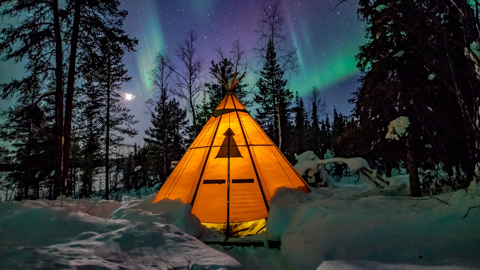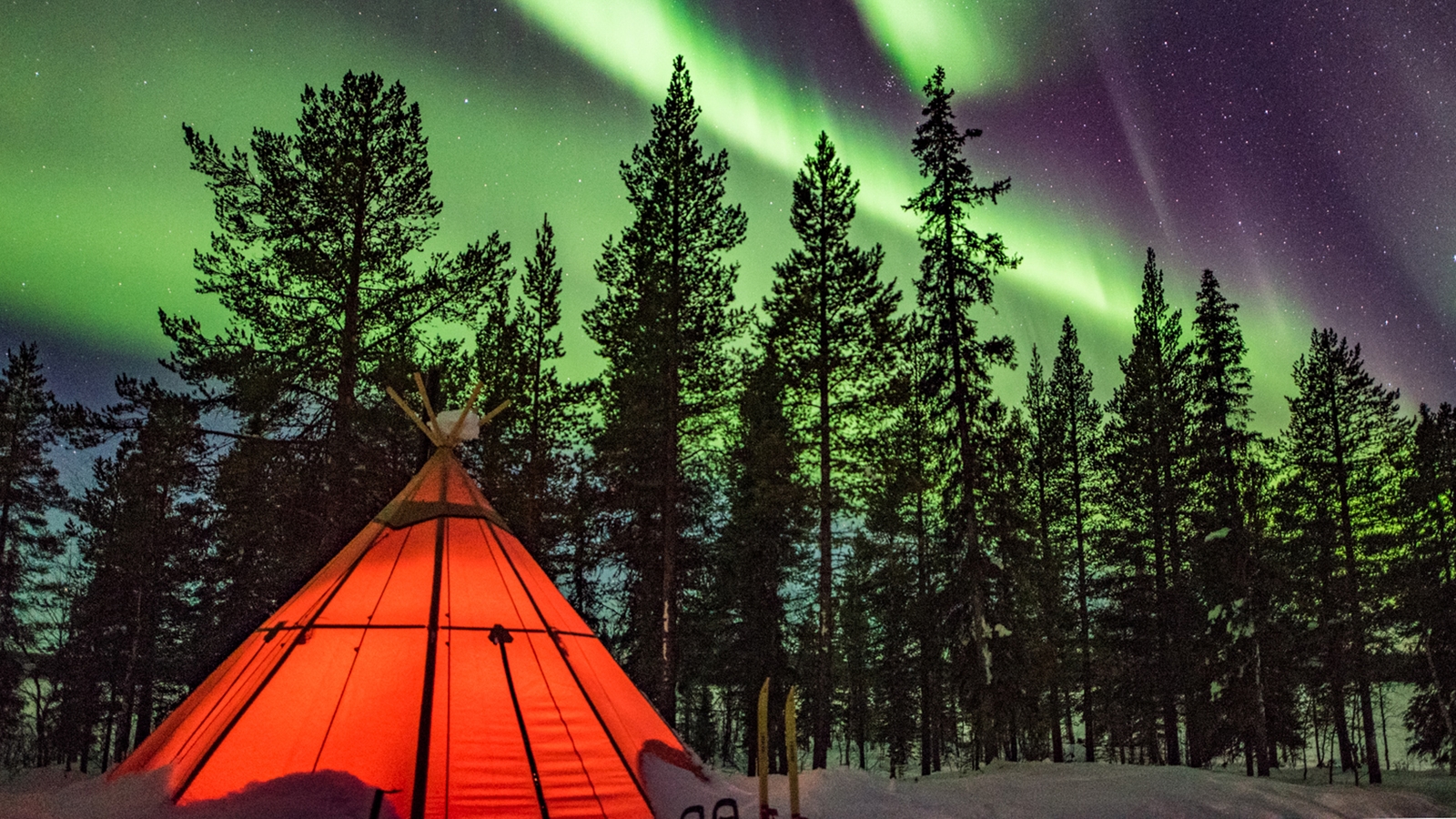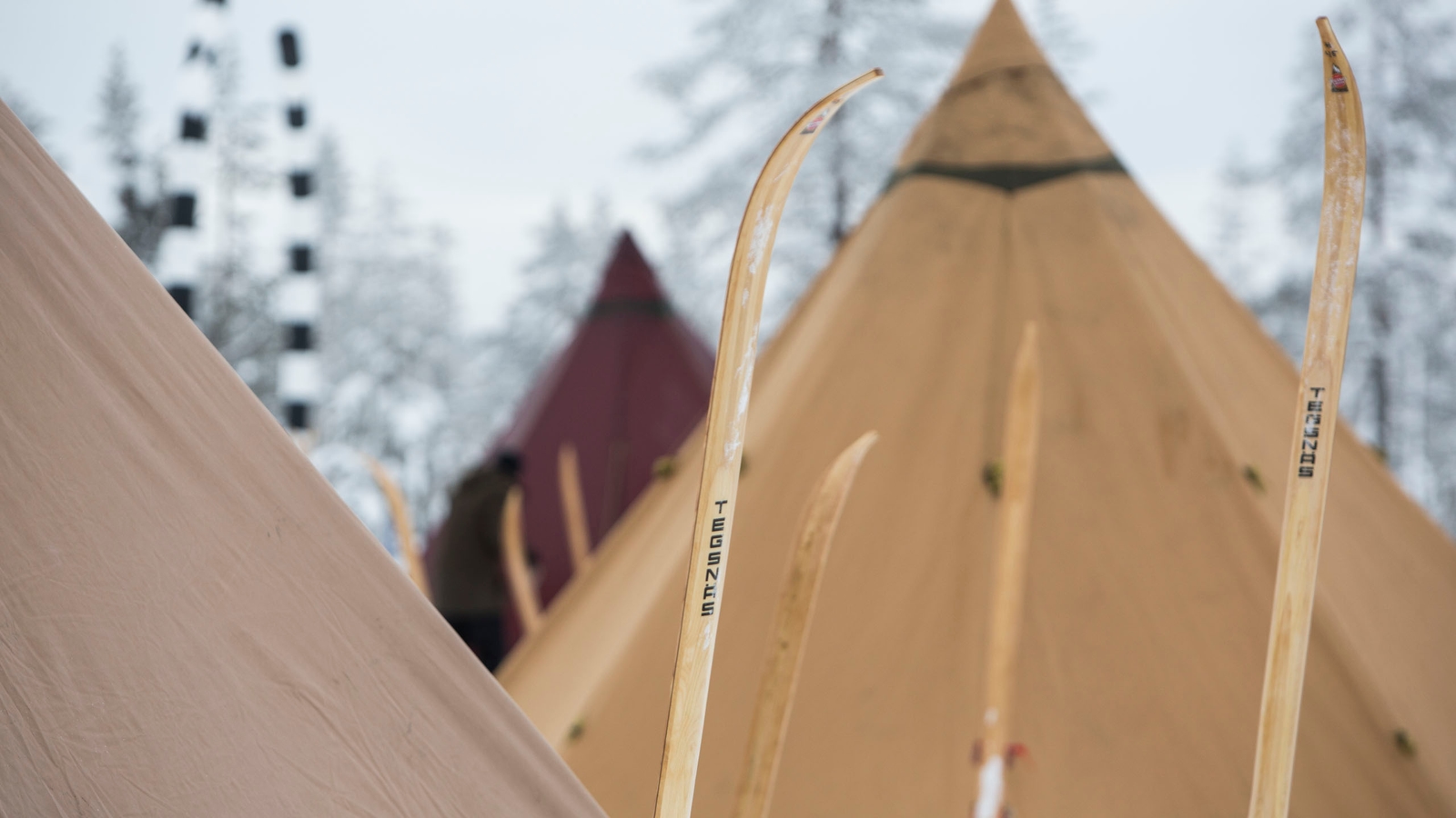 The camp consists of up to five traditional lavvu tents comfortably furnished with double beds, wood-fired stoves and simple Sami furniture, each stood on a wooden platform, spread out around a small cabin close to a central cabin with a dining room and warm outhouse.
