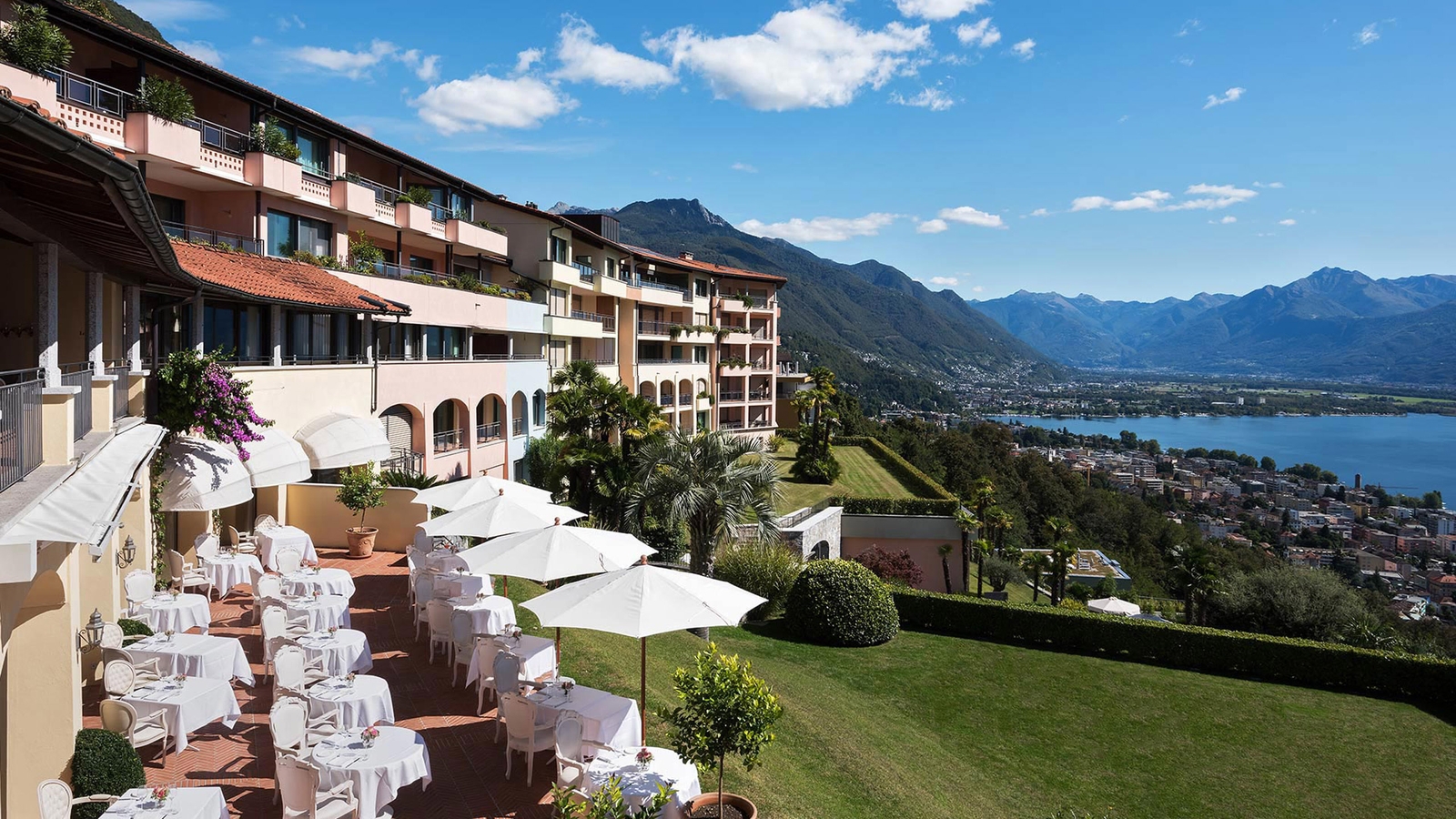 The crystal waters of Lake Maggiore sparkle before guests as they approach the Villa Orselina, a luxury hotel overlooking this Alpine paradise.