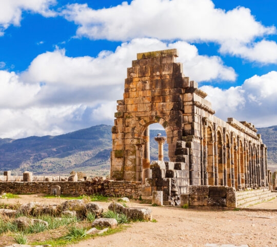 Drive through miles of vineyards and olive groves to Volubilis, a partly excavated and remarkably preserved Roman city. Built in a fertile agricultural area, it developed from the 3rd century BC onward as a Phoenician, then proto-Carthaginian, settlement before being the capital of the kingdom of Mauretania. Through olives and wine, it prospered under Roman rule from the 1st century AD and gained a number of major public buildings and fine town-houses with large mosaic floors.