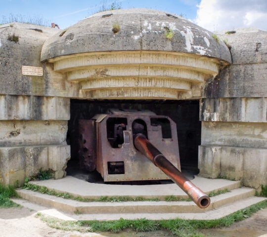 Longues-sur-Mer was the location of a German battery atop a cliff with magnificent views toward both Gold and Omaha Beaches. Mostly undamaged by naval and aerial bombardment, today is the only remnant of the Atlantic Wall defences to keep its big guns in place.