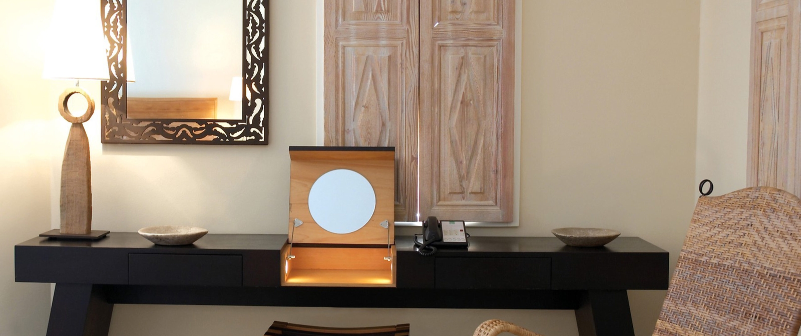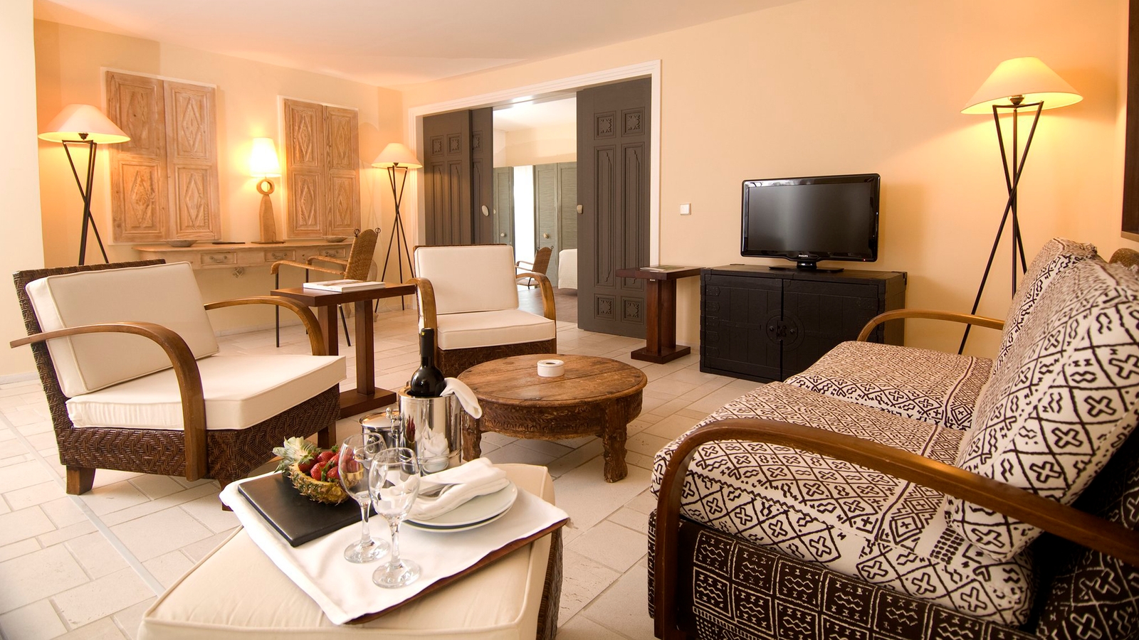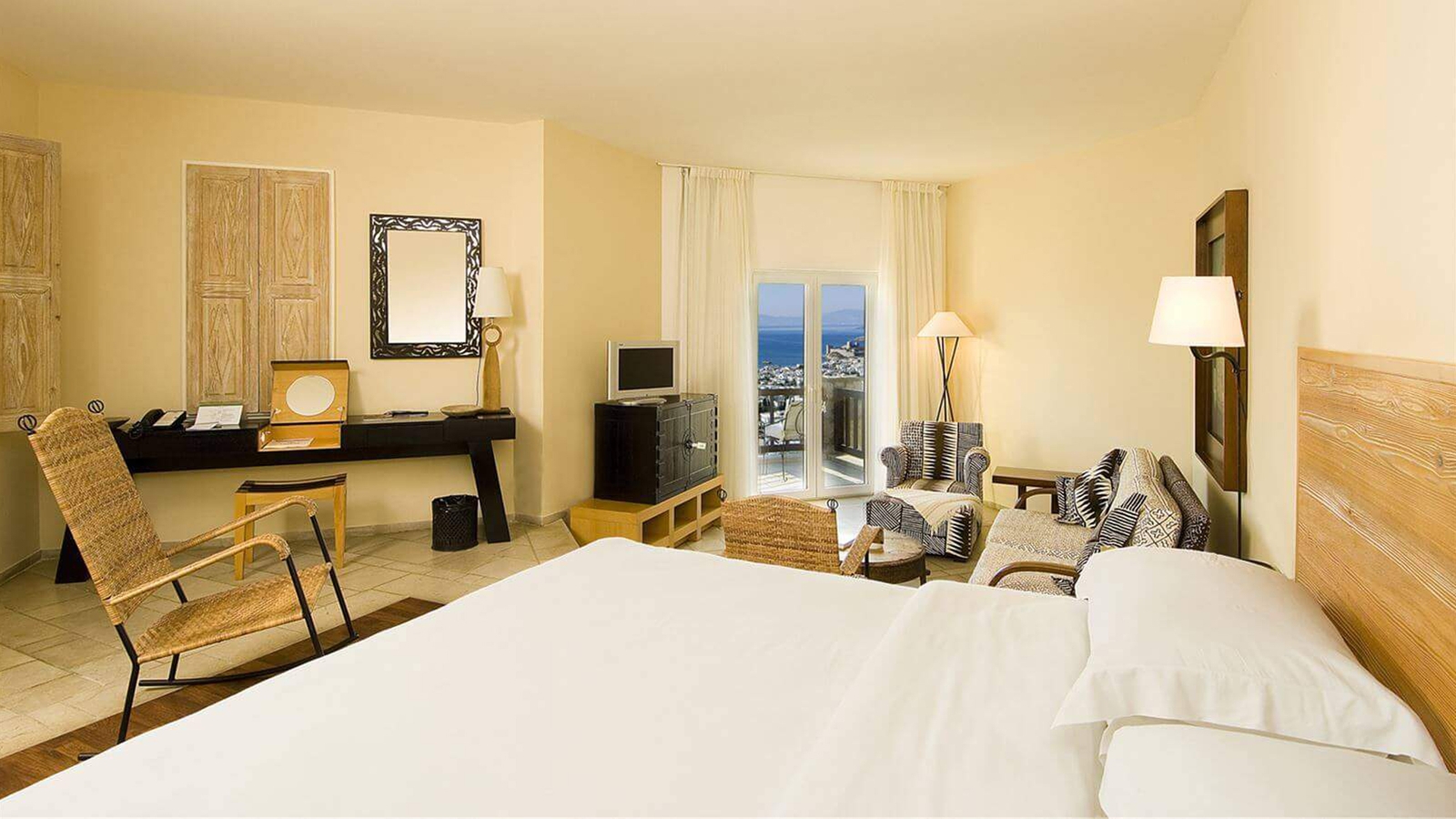 Rooms and suites feature soft tones, with a focus on white and cream materials, enhanced by dark woods and carved doors. The highlight of each airy space is the private balcony, facing the sea or surrounding grounds, while some suites encompass hot tubs and separated sitting areas.