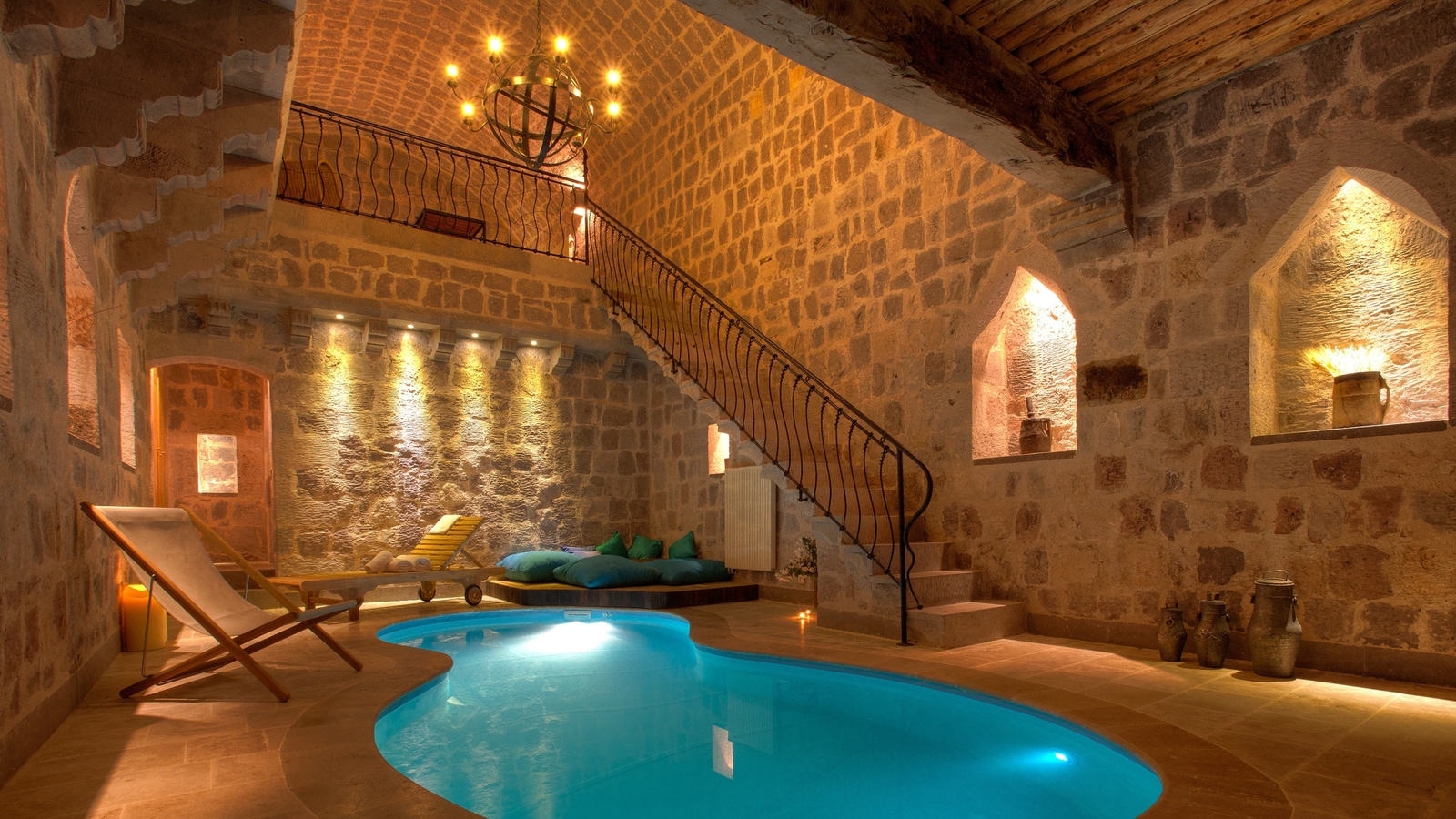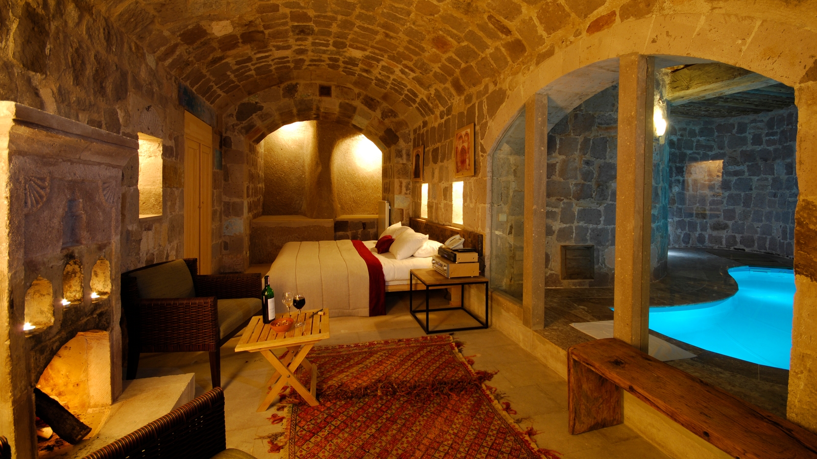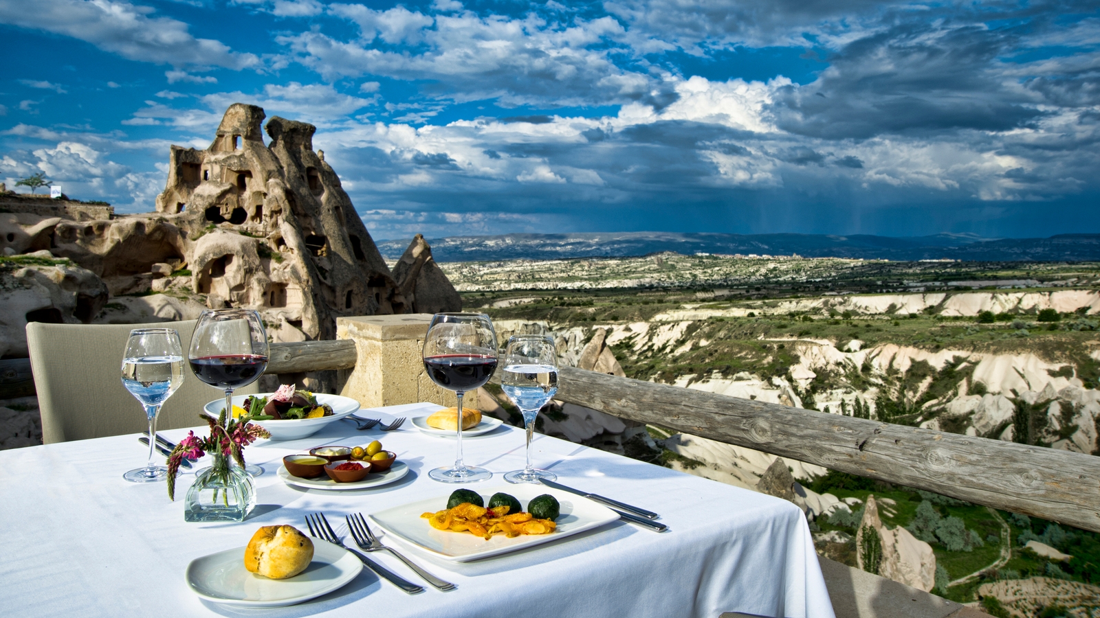 Dining is experienced on an outdoor terrace, jutting out over Pigeon Valley, and a menu of Turkish delicacies with Mediterranean flavors is on offer. A buffet breakfast is served every morning, and guests can unwind with snacks and drinks in the snug lounge by the fire. It’s also possible to sample the region’s finest wines in the vast wine cellar, dating back thousands of years and storing more than 22,000 bottles.