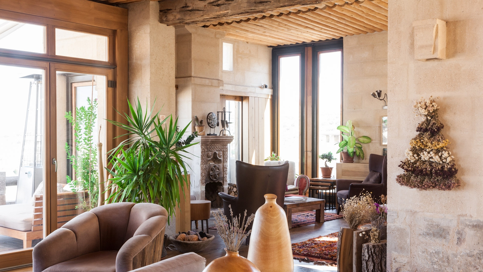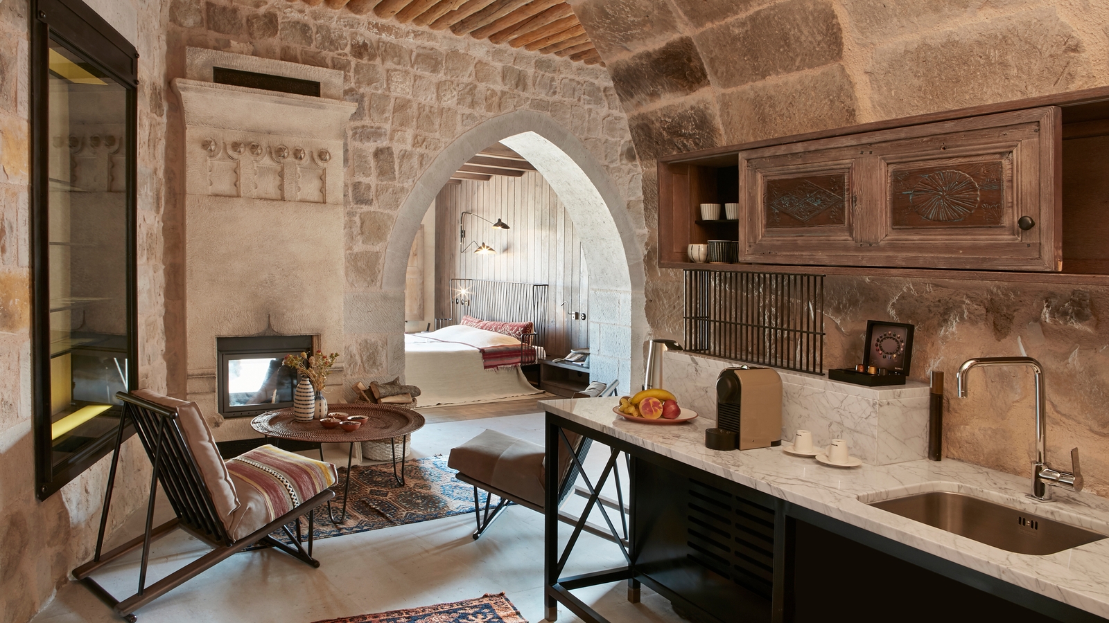 Set across seven restored mansions, 51 rooms and suites feature different designs, and guests can choose between the more authentic cave rooms, or the contemporary rooms with traditional touches. Some suites include private cave pools, open fireplaces and balconies, overlooking the striking landscape. Expansive bathrooms carved out of natural stone, encompass walk-in showers and gaping baths.